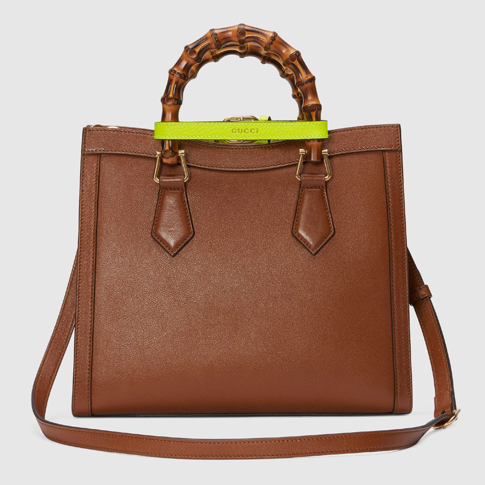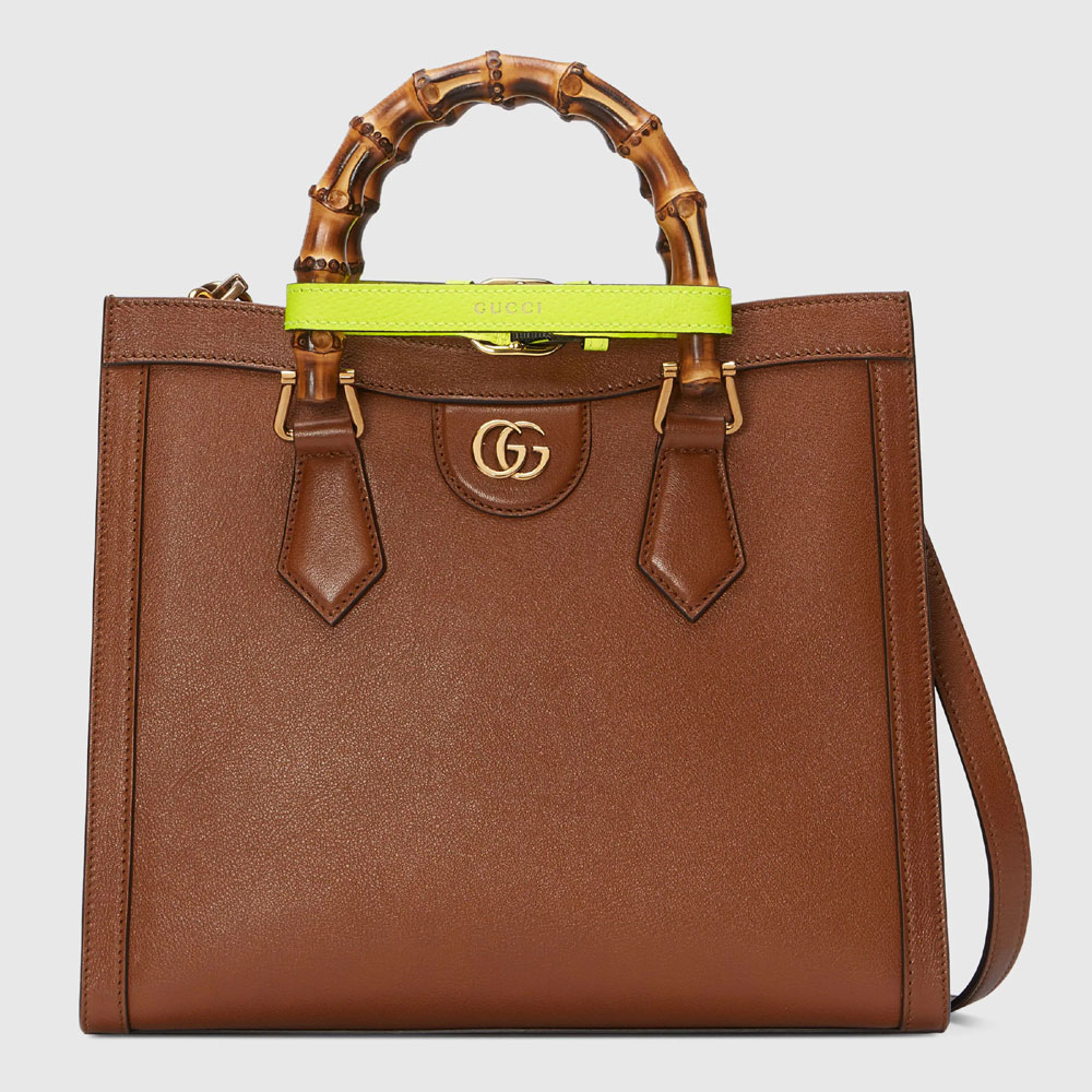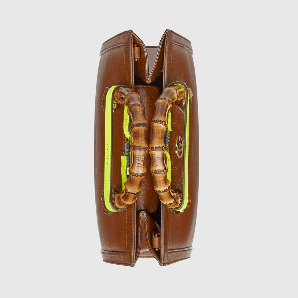 Combining recognizable elements of the House. the small tote bag is defined by its bamboo handles and Double G hardware. Crafted from brown leather. the accessory is further accentuated by two neon bands. a playful reference to the bands used to keep handles in shape.