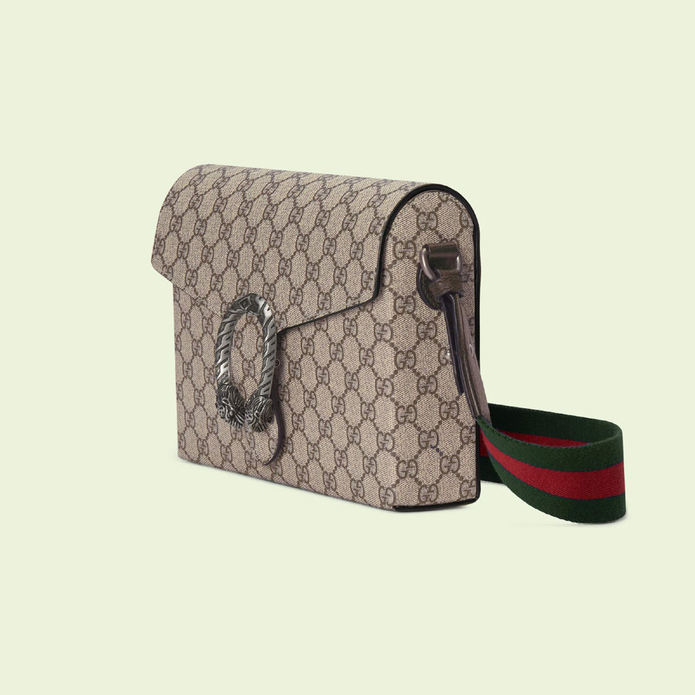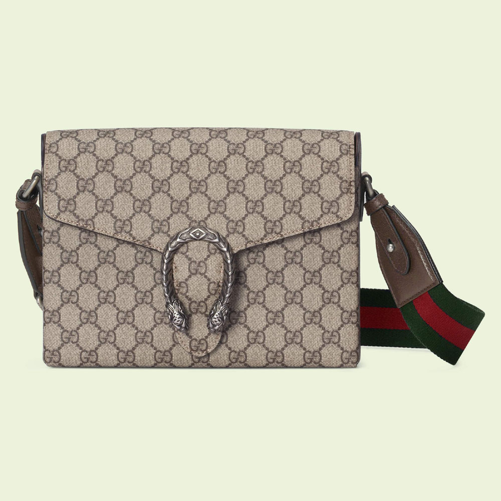 During the Cruise 2023 Gucci Cosmogonie fashion show. new constellations of House codes were presented. The now recognizable tiger head closure continues to decorate new iterations of the Dionysus. this time as part of the luggage line. Here. the small structured shape in beige and ebony GG Supreme canvas is completed by the archival Web strap.