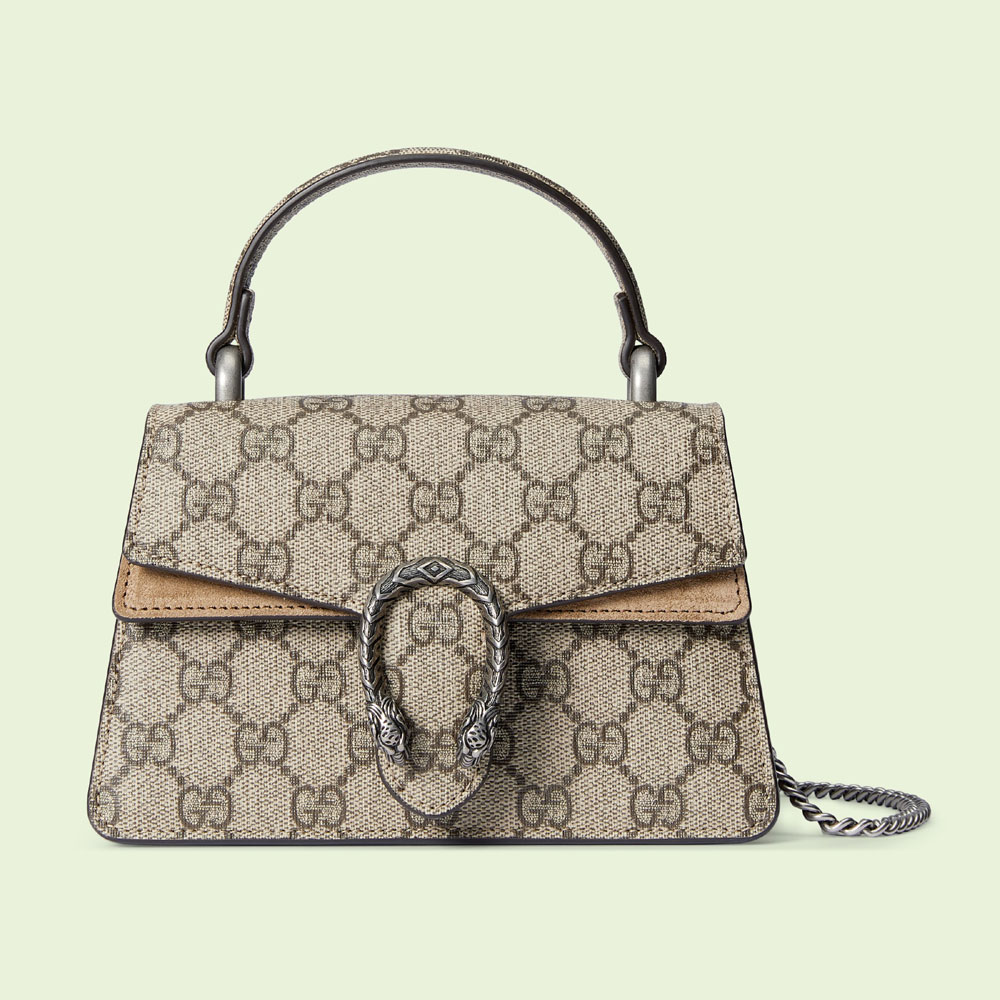 Presented in a mini dimensions for Pre-Fall 2023. this Dionysus bag in beige and ebony GG Supreme canvas is defined by the tiger head spur closure. a beloved symbol of the House. A taupe suede trim enriches the design with contrasting textures.