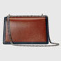 The Dionysus is defined by its emblematic closuretwo tiger heads shaped in the form of a spur. an ode to the Greek god who in myth is said to have crossed the river Tigris on a tiger sent to him by Zeus. Here. the small shoulder bag's palladium-toned hardware is further enriched by white enamel.