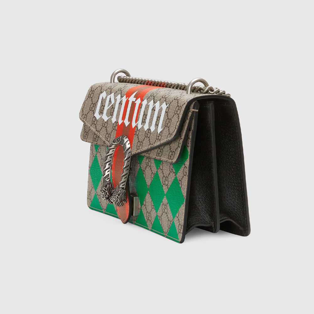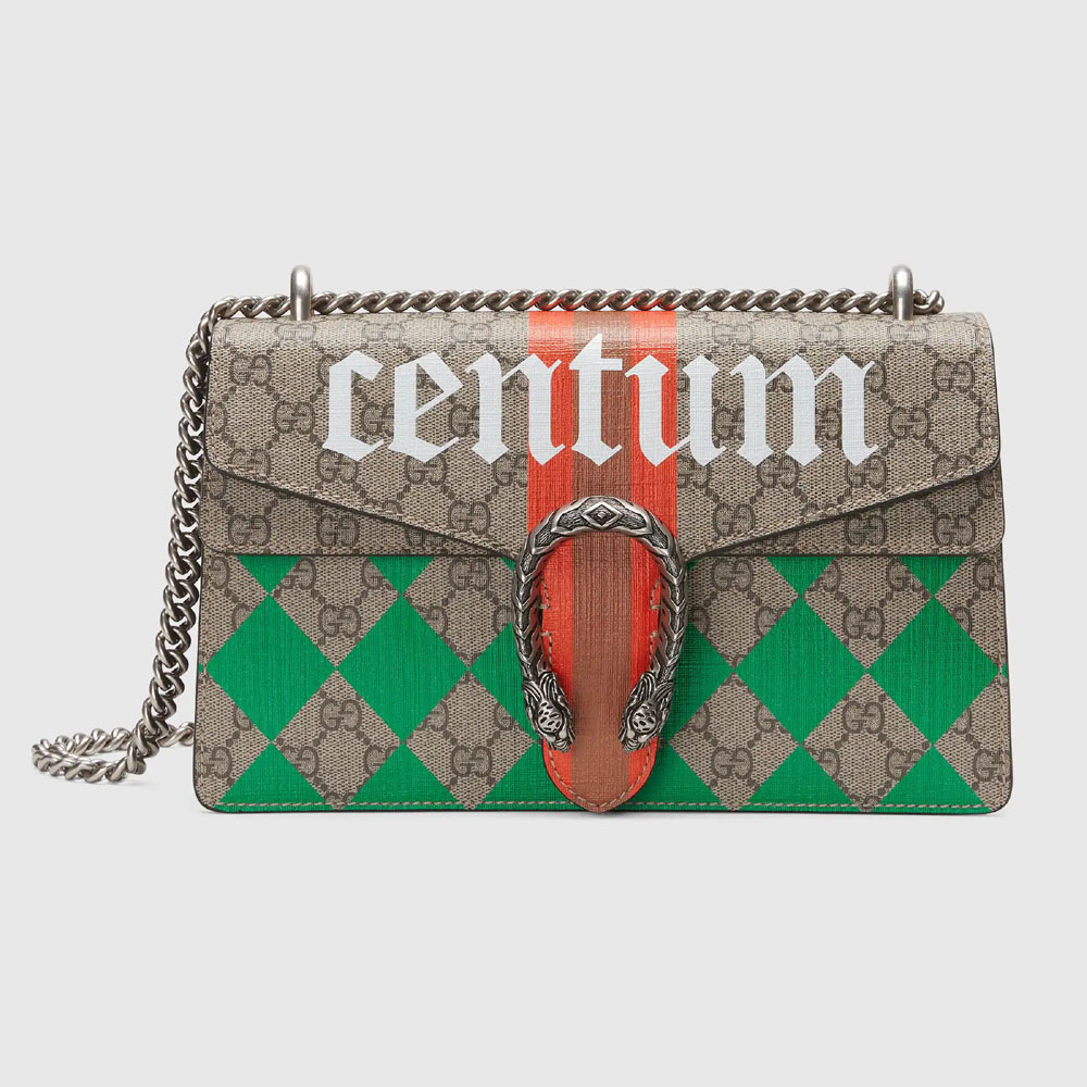 This item features bright and colorful geometric motifs that recall the uniforms worn by horse riding jockeys. The collection is inspired by the Parade Ring. or paddock. where horses walk around as a warm-up before the race and to help racegoers pick a winner. Here the print appears on this Dionysus shoulder bag. completed by the Centum print.