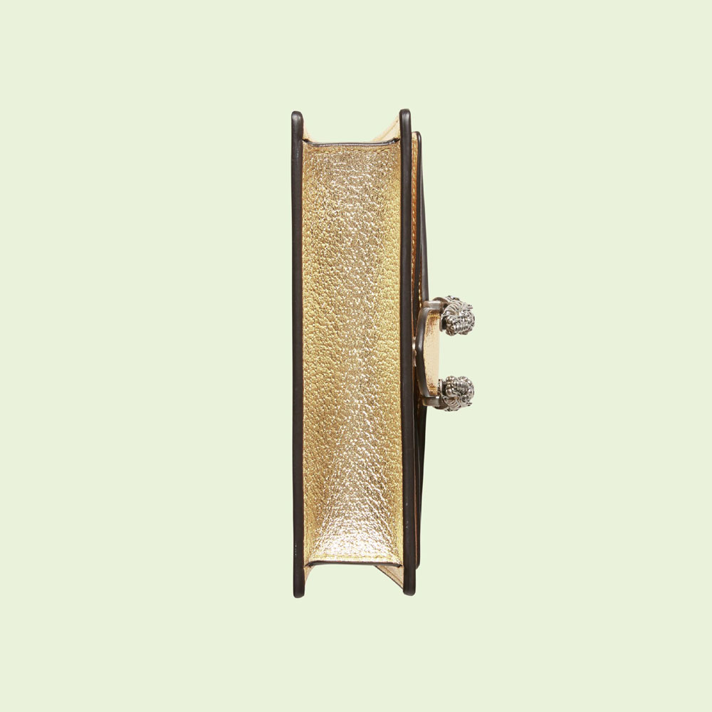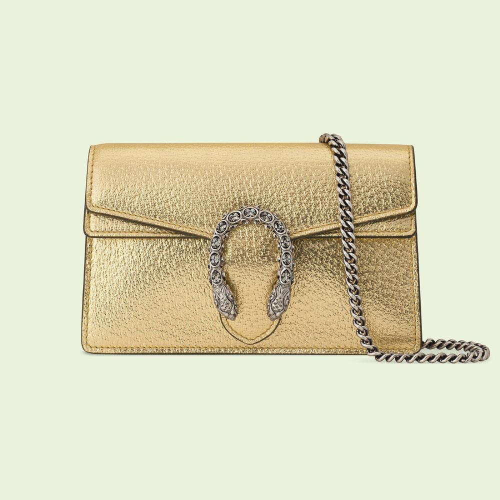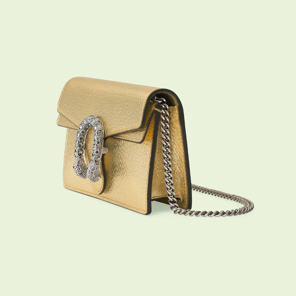 The structured super mini bag is introduced in metallic gold leather. with a key ring that can be used to attach the bag to a separate larger bag. The closure features the textured tiger head spurthe unique detail defines the line. referencing the Greek god Dionysus. who in myth is said to have crossed the river Tigris on a tiger sent to him by Zeus.