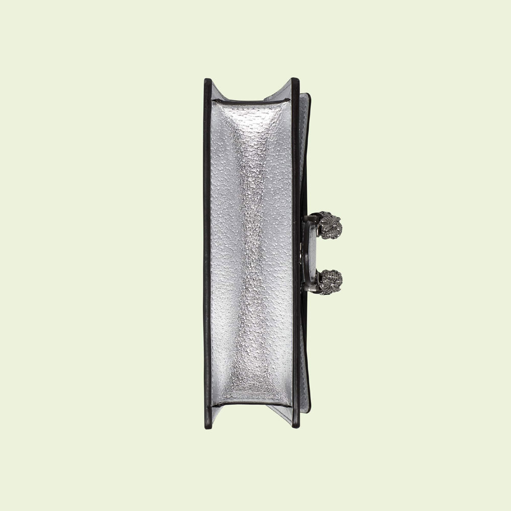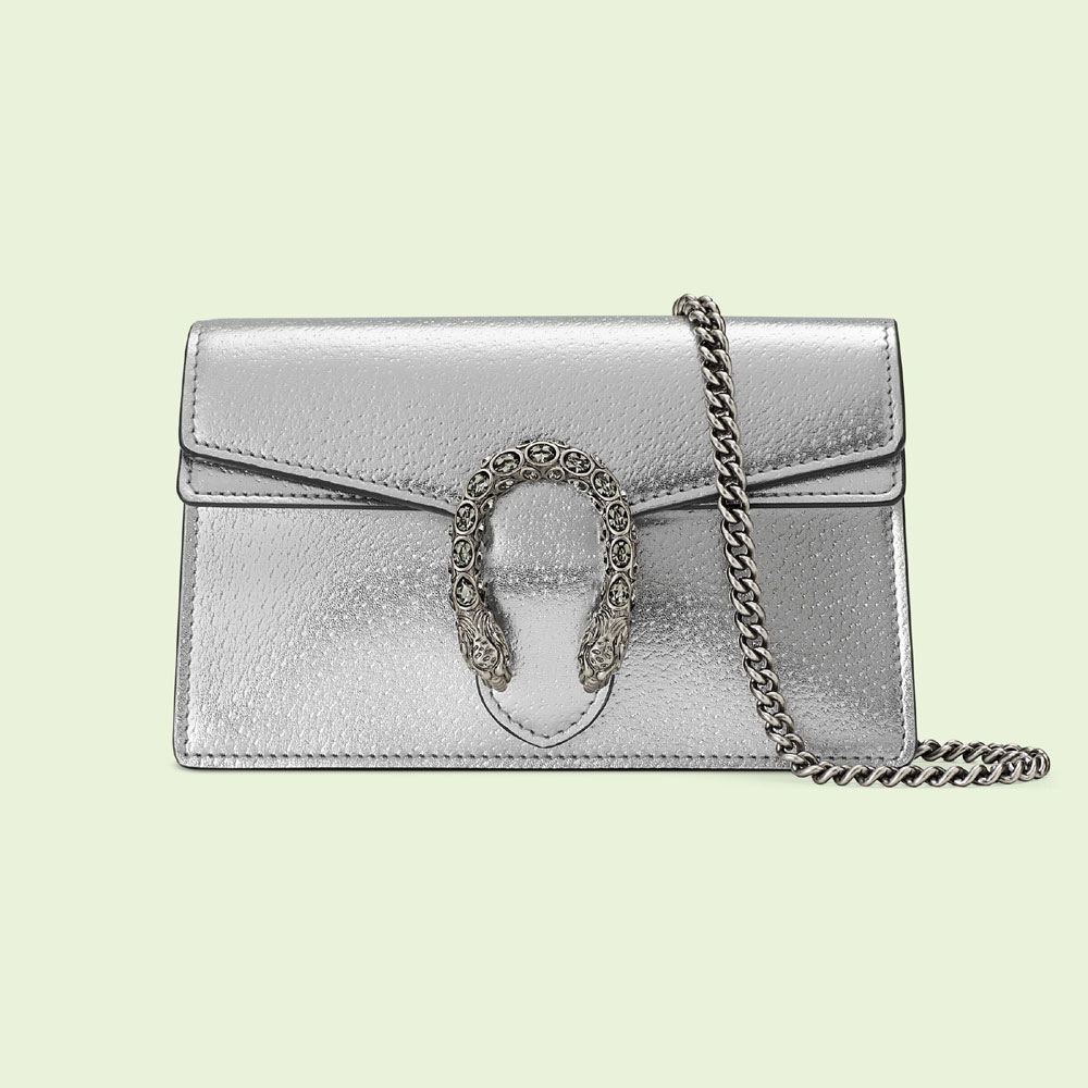 The structured super mini bag is introduced in metallic silver leather. with a key ring that can be used to attach the bag to a separate larger bag. The closure features the textured tiger head spurthe unique detail defines the line. referencing the Greek god Dionysus. who in myth is said to have crossed the river Tigris on a tiger sent to him by Zeus.