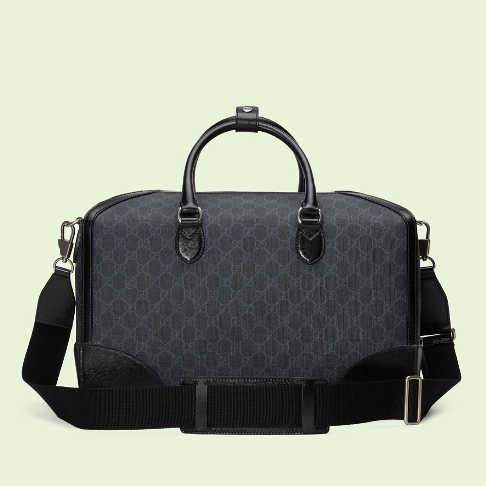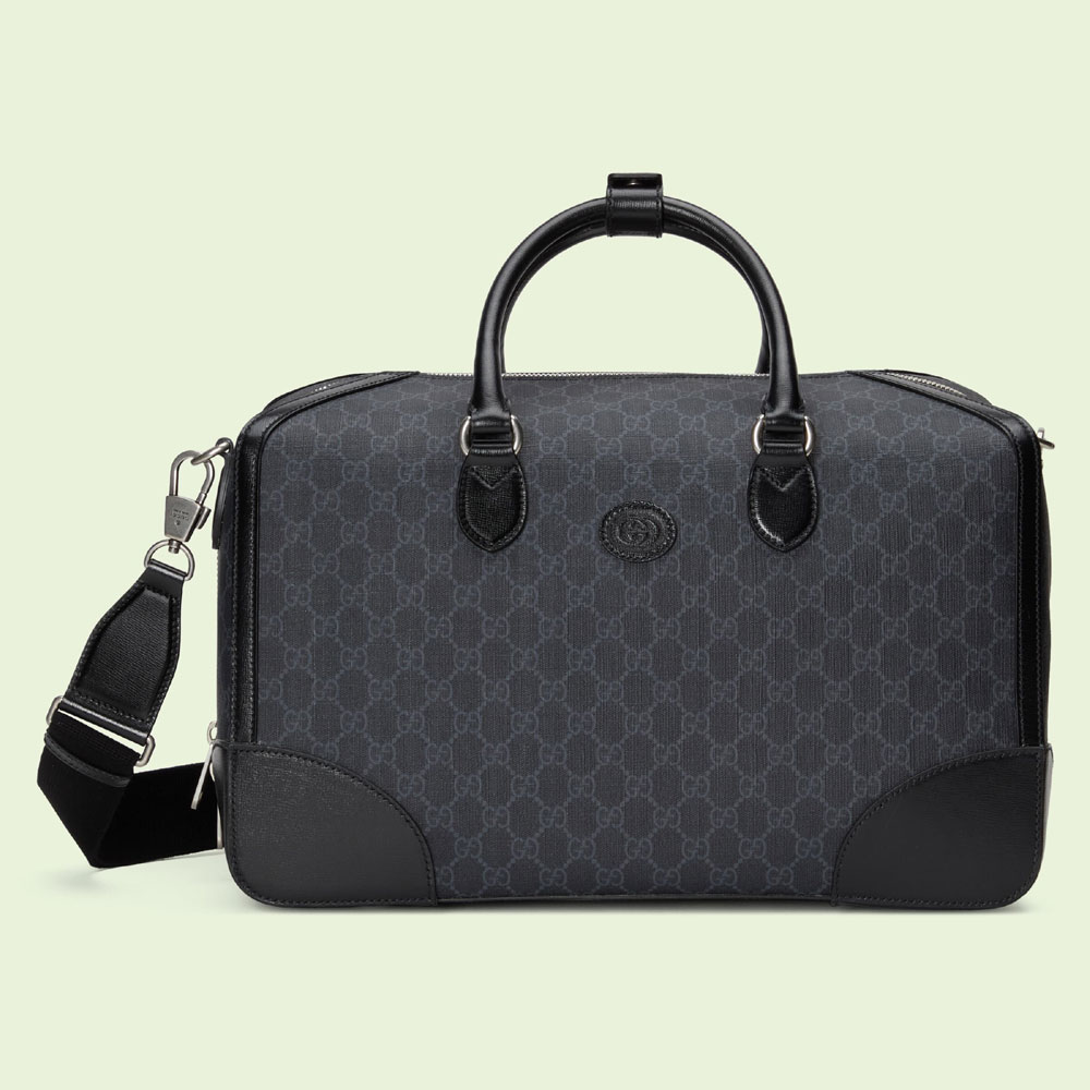 The Interlocking G has remained one of the most symbolic codes of the House since its introduction. The distinguishing emblem appears as a leather detail atop this duffle bag. a subtle reference to Founder Guccio Gucci. Completing the design's logo feel. a contemporary black GG Supreme canvas appears alongside a black leather trim.