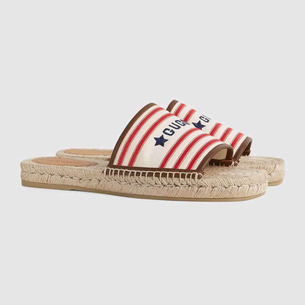 Carefully constructed in Spain. these slide sandals are defined by a playful stripe motif and finished with the Gucci star motif. An emblematic style. Gucci's espadrilles carry a laid-back feel within their waves and speak to the classic feel that runs throughout the Gucci Love Parade collection.