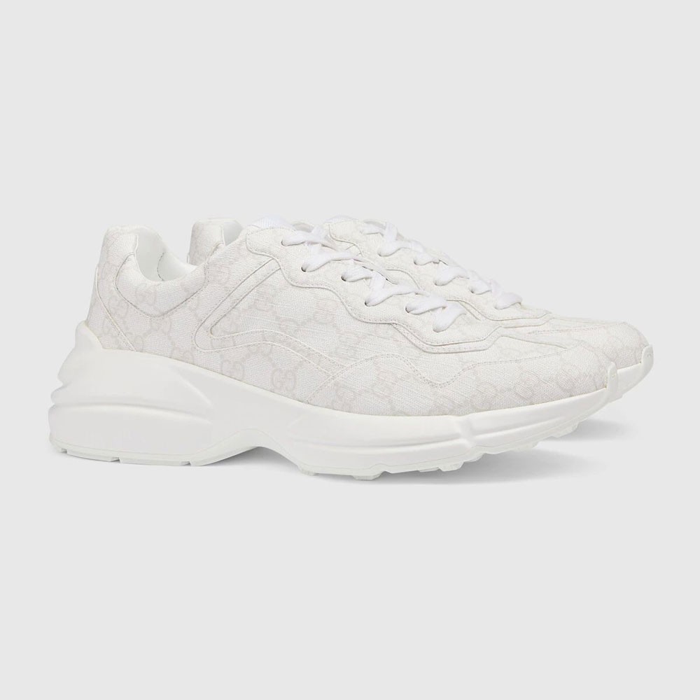 Building on its historic origins. GG Supreme is introduced in new colors and atop unexpected styles for the Gucci Love Parade collection. The canvas has come to the front of each collection decade after decade to become a hallmark of the House. Here. this Rhyton sneaker is crafted from the material in a minimalist shade of white.