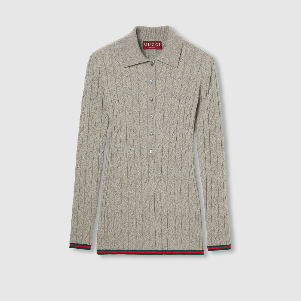 Introducing new knitwear styles, sophisticated yarn provides volume, and is further elevated through artisanal details which highlight rich textures. With a new focus on yarns, these knits can be worn alone as a standout piece, or layered to complement the Fall Winter 2024 wardrobe. This fine cable and rib wool polo top is defined by a Web trim.