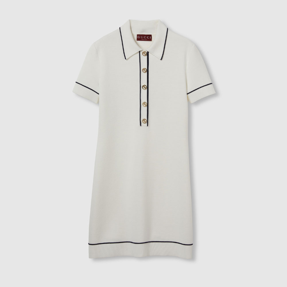 This elegant white merino dress from Gucci's Cruise collection offers timeless versatility. Pair it with navy-blue tailored blazers to echo the contrast disc fasteners, or layer with a lightweight beige cashmere cardigan for relaxed sophistication. For daytime chic, add white leather loafers and a structured GG Marmont shoulder bag; transition to evening with metallic strappy sandals and minimalist gold jewelry.