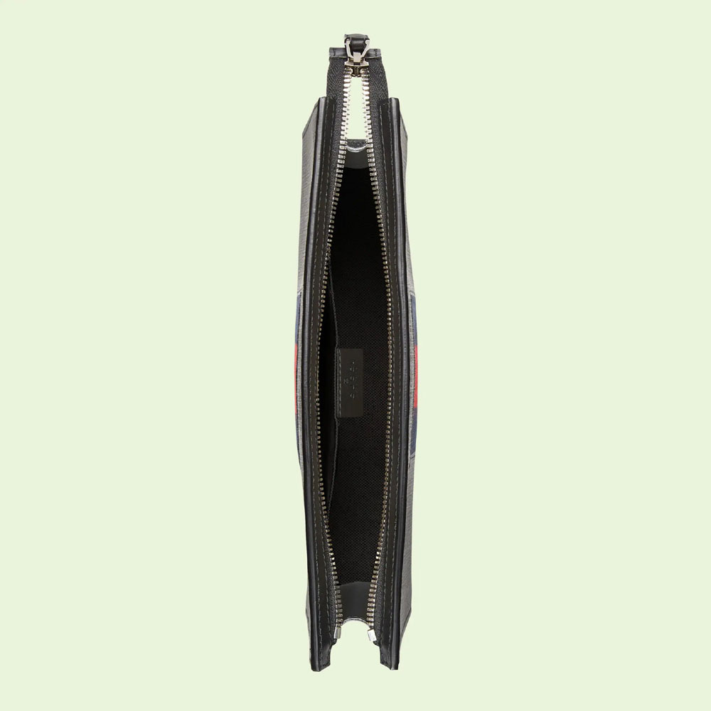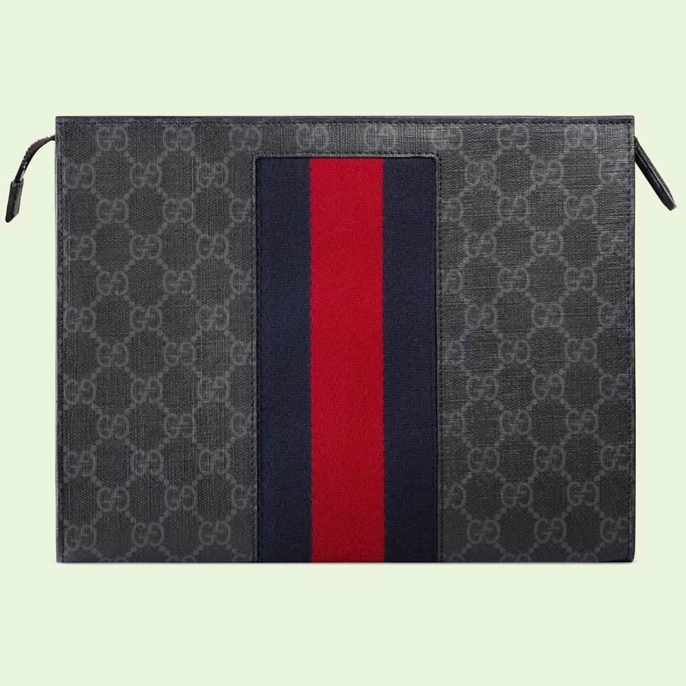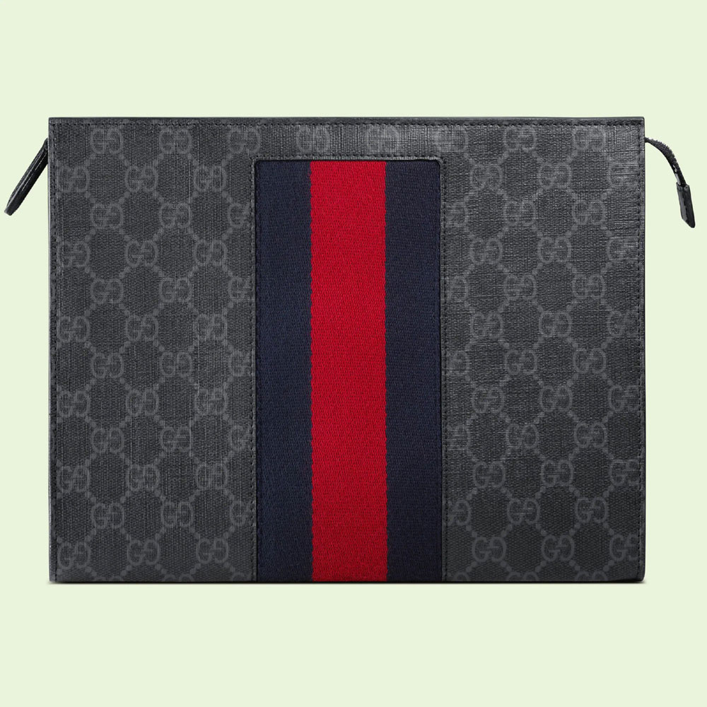 A combination of two of Gucci's most recognisable icons: the GG motif and the Web. This pouch is made in GG Supreme canvas. with House Web stripe.