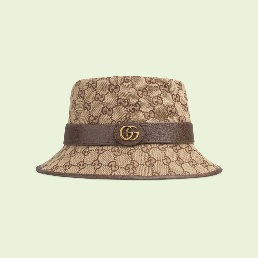Crafted from monogram canvas. this bucket hat is completed by a tonal leather trim. Enhanced by the historic Double G detail on the side. both the archival references and the shape speak to the vintage feel that permeates the House's design narrative.