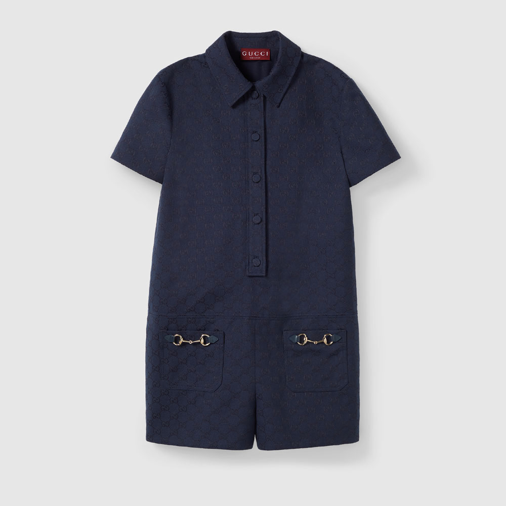 This elegant Gucci jumpsuit, crafted in signature GG canvas with a refined Horsebit accent, pairs effortlessly with tailored layers. For a polished look, layer a crisp white blazer or a cropped leather jacket. Complement its deep navy hue with neutral-toned accessories like beige loafers or metallic sandals. Explore yupoo clothes Gucci for coordinating belts or silk scarves to accentuate the waistline.