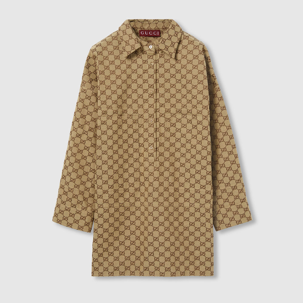 Effortlessly chic, this Gucci GG canvas shirt in camel brown pairs beautifully with tailored white trousers for a crisp contrast. Layer it over a slim-fit black turtleneck in cooler weather, or wear it open as a lightweight jacket with high-waisted denim shorts.