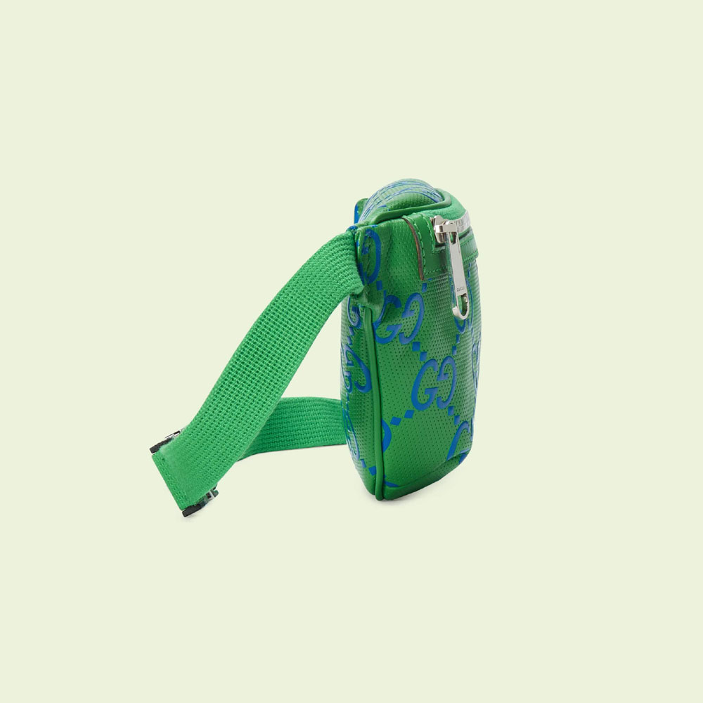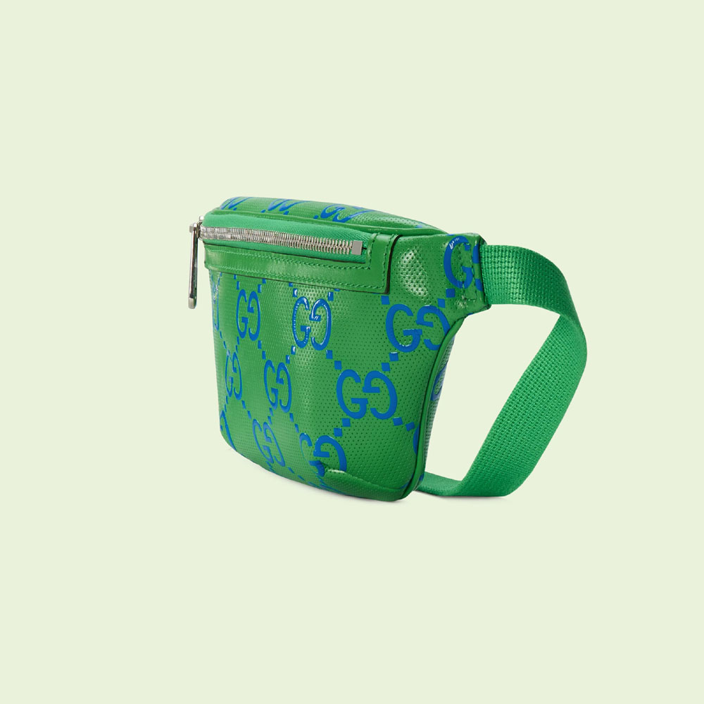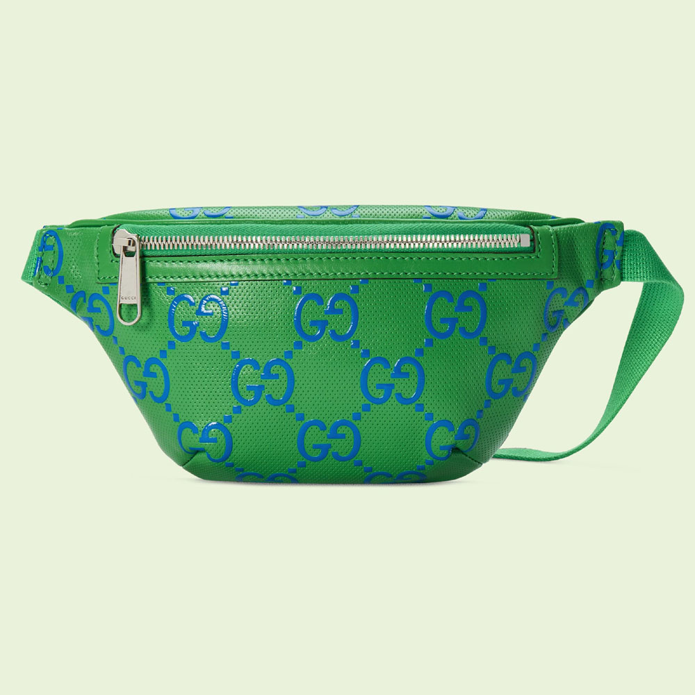 The initials of Founder Guccio Gucci continue to decorate luggage accessories. connecting contemporary travel pieces to Gucci's roots as a luggage porter. Here the emblematic GG motif appears in a playful two-toned embossed leather atop this belt bag. Noted for its softness and slightly shiny finish. the GG leather plays on texture. embossing the House emblem in blue onto a green base.