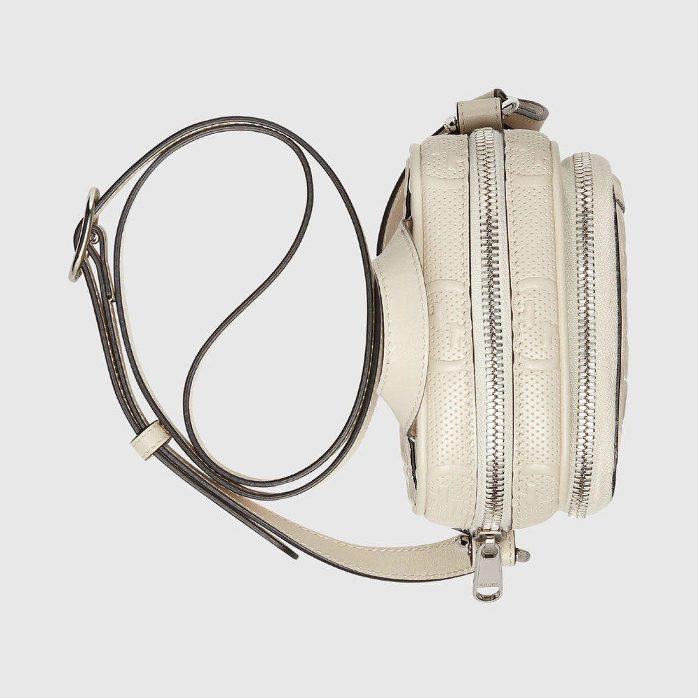 The mini bag is introduced in a new interpretation of the GG motif presented within the Ouverture collection. Noted for its softness and slightly shiny finish. the GG leather plays on texture. embossing the House emblem onto a white perforated leather base.
