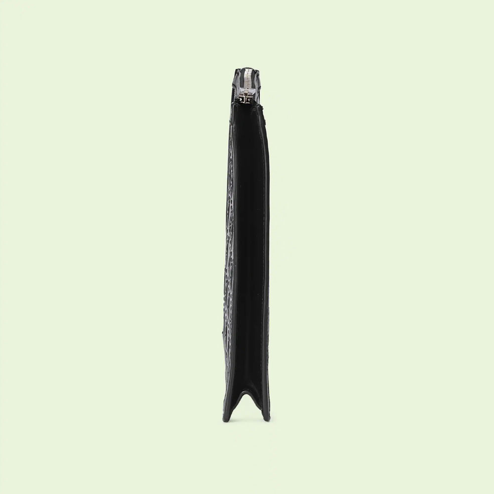 Playing with textures and materials the monogram appears as an embossed detail against a black leather base atop this portfolio shaped pouch. Part of the Houses codes first presented during the 30s. the distinctive GG motif has been the inspiration for new explorations of expression for almost a century.