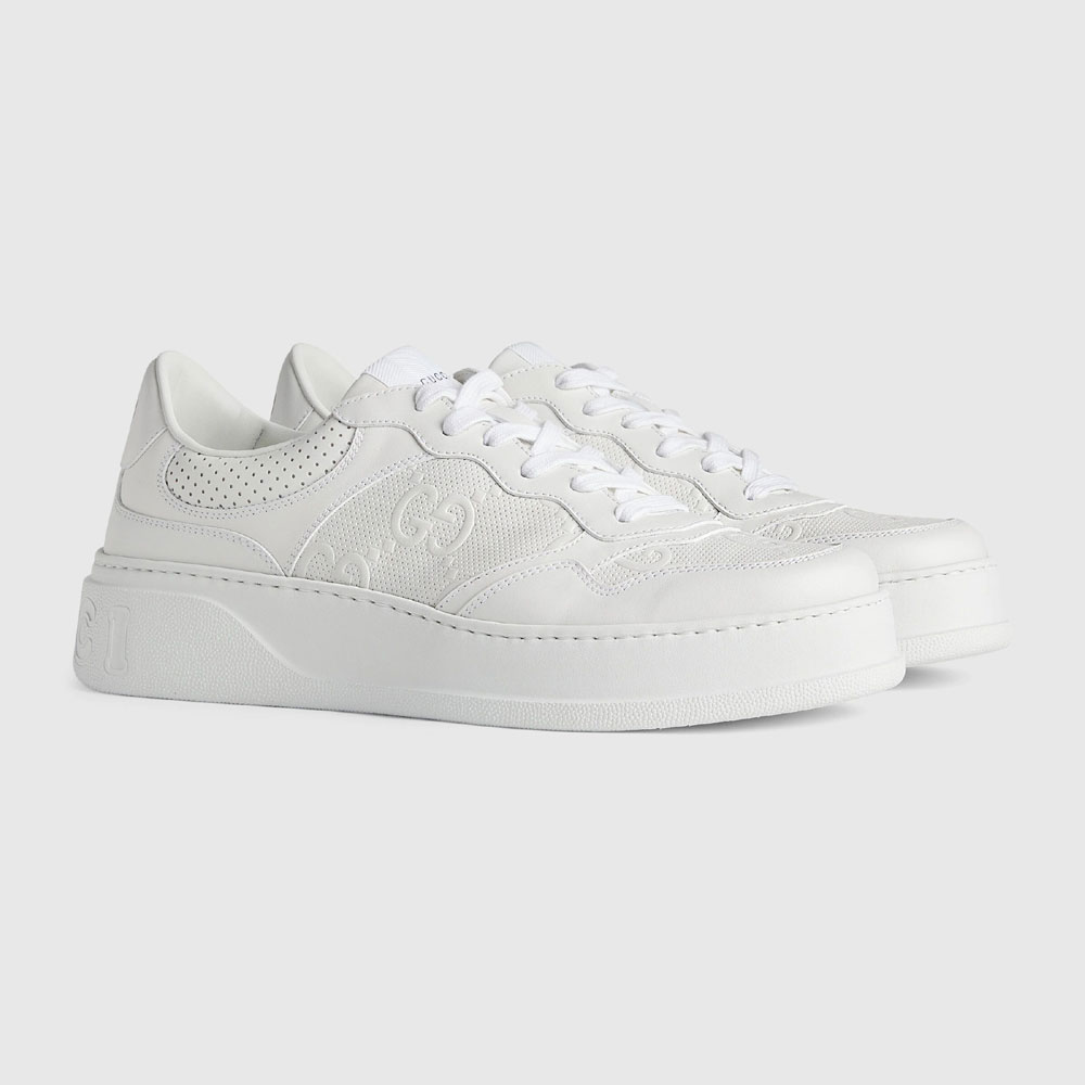 This sneaker's chunky silhouette gives it a playful. retro feel. Gucci's collections continue to look to other eras. finding inspiration in the everyday and bringing them to the present. Crafted from white GG embossed leather. the monogram motif adds a logo twist.