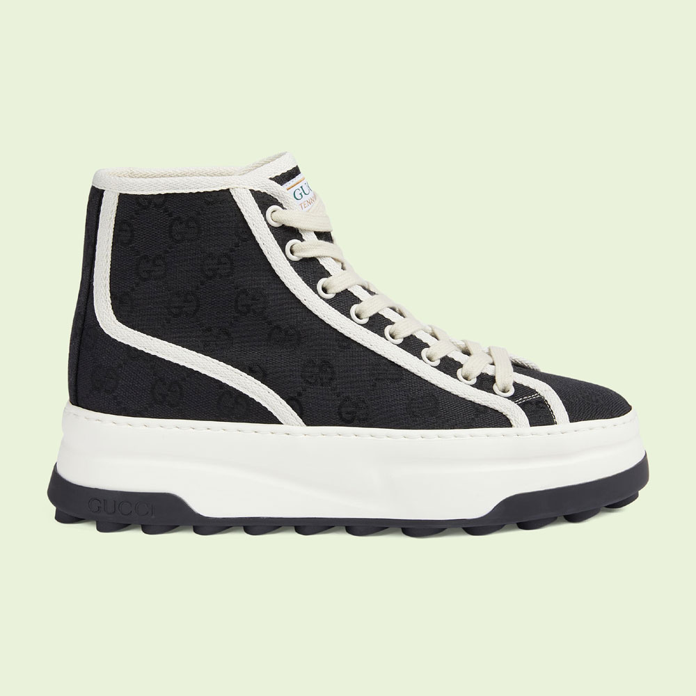 A striking silhouette that takes inspiration from the tennis courts. Presented in a tonal black Original GG canvas. this high top sneaker features a chunky sole and a contrasting fabric trim for a contemporary aesthetic.