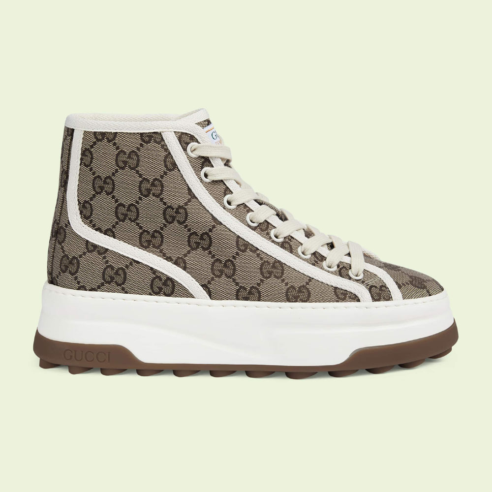 A striking silhouette that takes inspiration from the tennis courts. Presented in a classic beige and ebony Original GG canvas. this high top sneaker features a chunky sole and a contrasting fabric trim for a contemporary aesthetic.