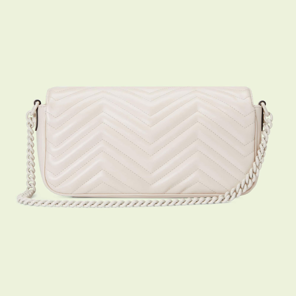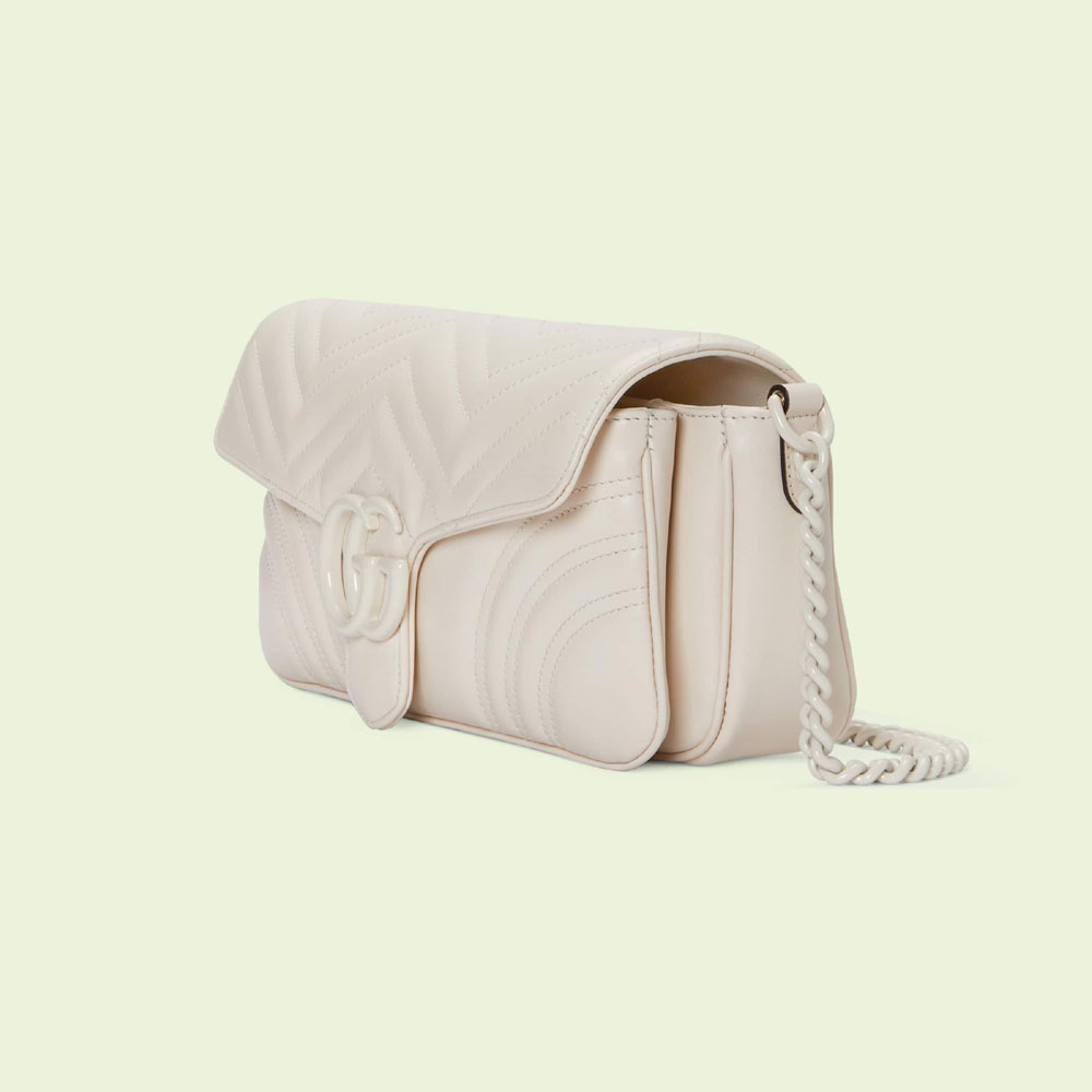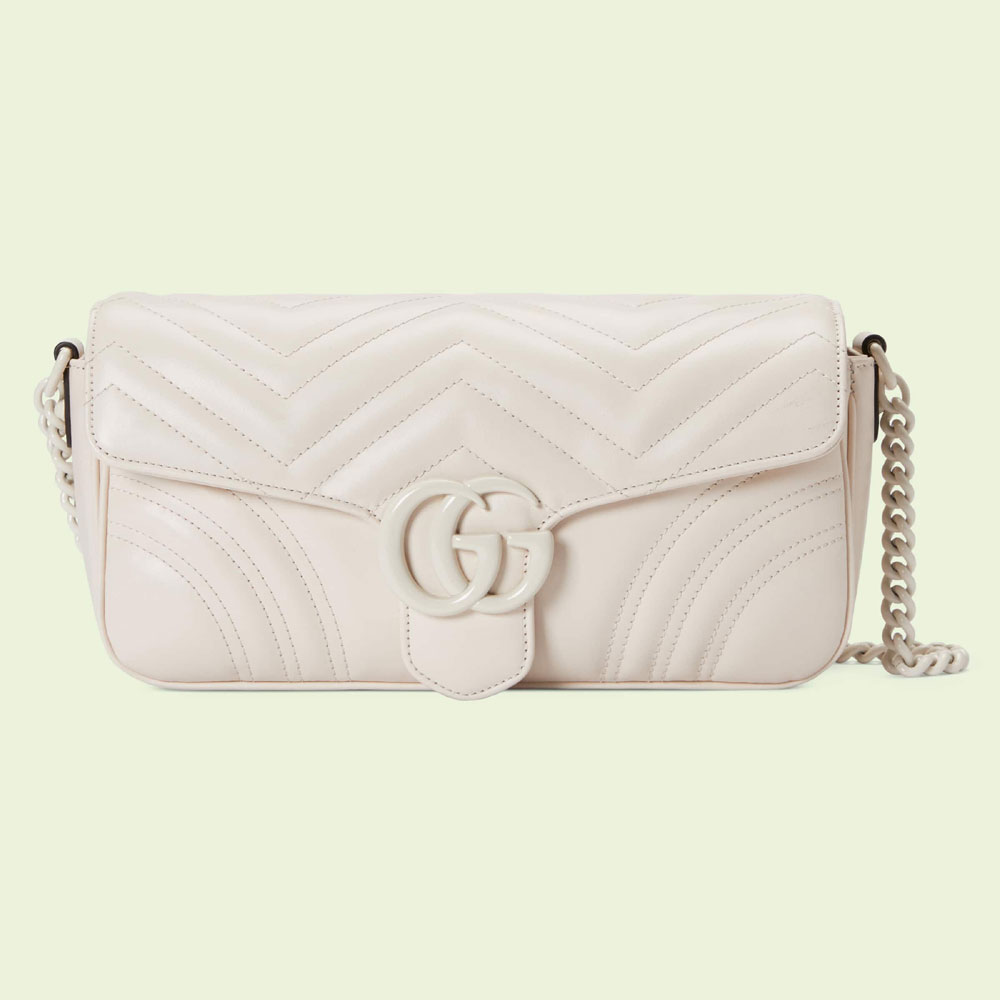 Emblematic styles that are dear to the House continue to explore new expressions across each new collection. The GG Marmont is characterized by the unmistakable Double G hardware and materials with an intricate matelasse finish. Here. this shoulder bag is presented in white leather with tonal hardware.