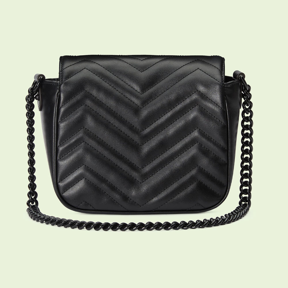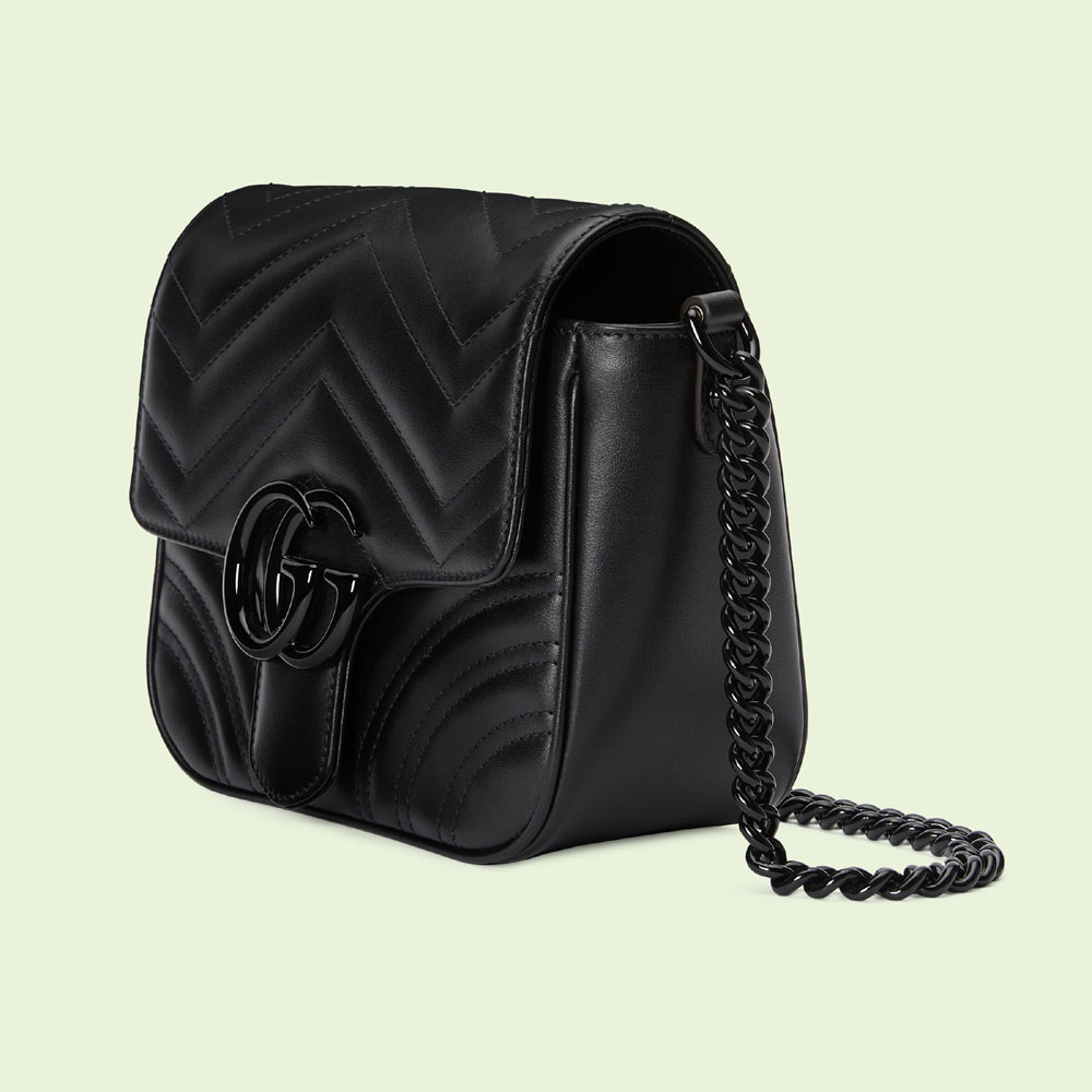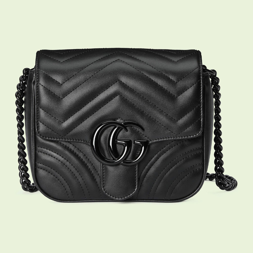 With its recognizable matelasse fabric and Double G hardware. the GG Marmont has become synonymous with the House. Continuously reinvented through the seasons. new shapes are introduced within this signature line. matching Gucci's contemporary vision. Crafted in black leather. this structured mini shoulder bag is defined by a tonal buckle and chain. exploring rich textures and geometric forms.