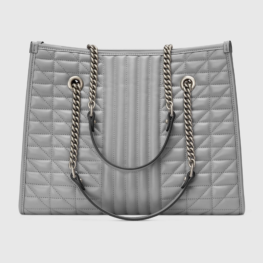 Gucci Aria explores the House's archives. telling Gucci's story though a mix of archival and contemporary elements. The GG Marmont was introduced in one of the Creative Director's first fashion shows and each season its design evolves through the lens of the latest collection. Here. the tote bag is presented in dark grey matelasse leather with antique silver-toned hardware.