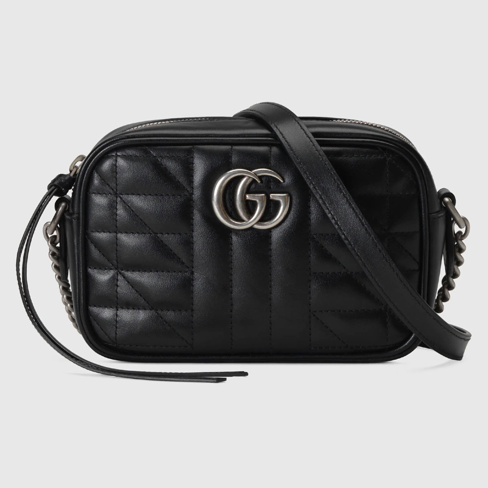 A member of the Houses Beloved lines. the GG Marmont is characterized by the brands emblematic monogram hardware and matelasse leather. For The Gucci Aria collection. the style is reimagined with a new geometric approach to the signature material while its Double G hardware is presented with an antique silver-toned finish. The design appears here in the shape of a mini shoulder bag in black.