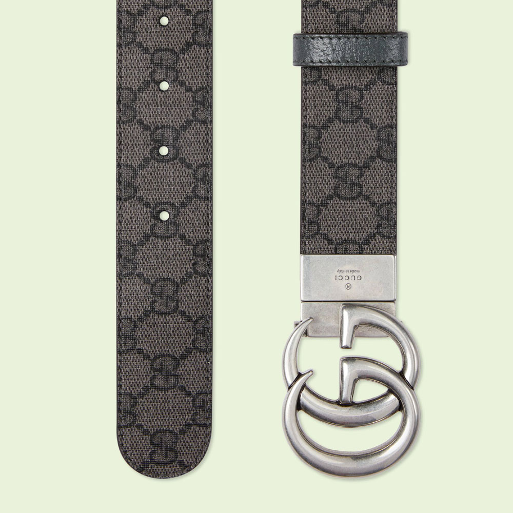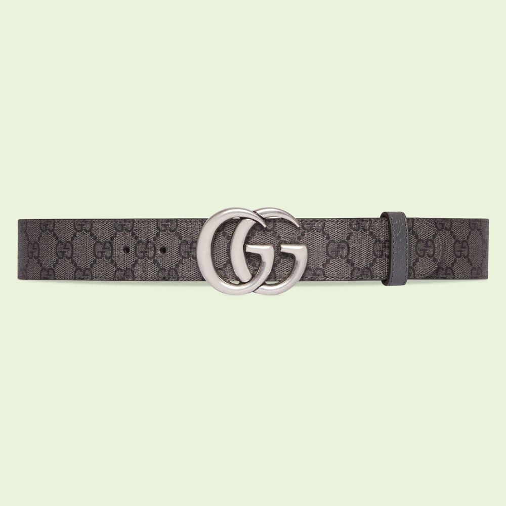 Evolving season after season. the GG Marmont's recognizable design blends the 70s GG hardware with contemporary styles. This grey and black GG Supreme canvas belt reverses to grey leather offering an alternative look.