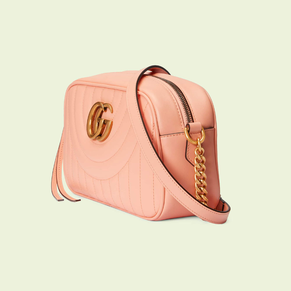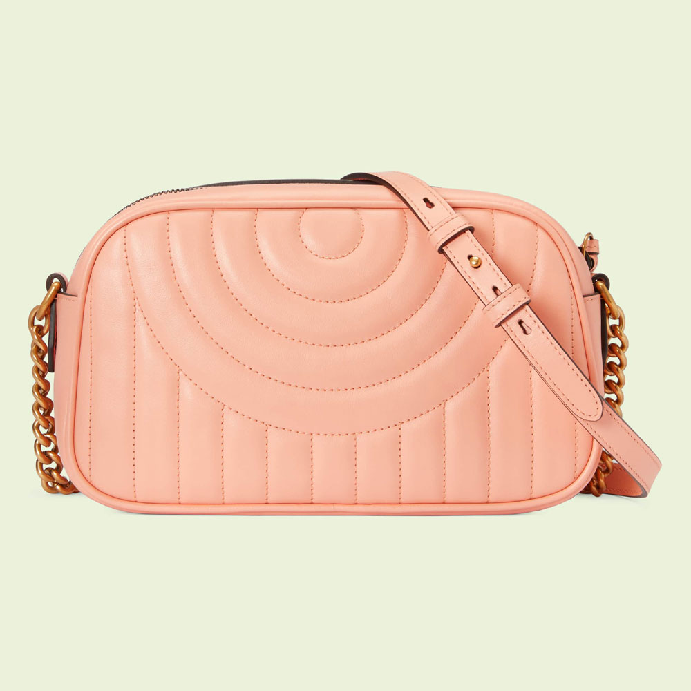 The small GG Marmont chain shoulder bag has a softly structured shape and a zip top closure. completed by the Double G. The leather shoulder strap is adjustable. allowing it to be styled as a crossbody. whereas matelasse leather with a geometric design draws attention to the line's monogram hardware.