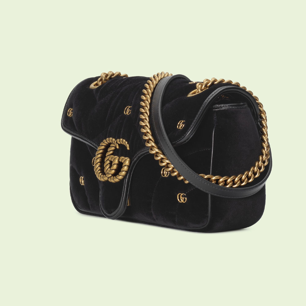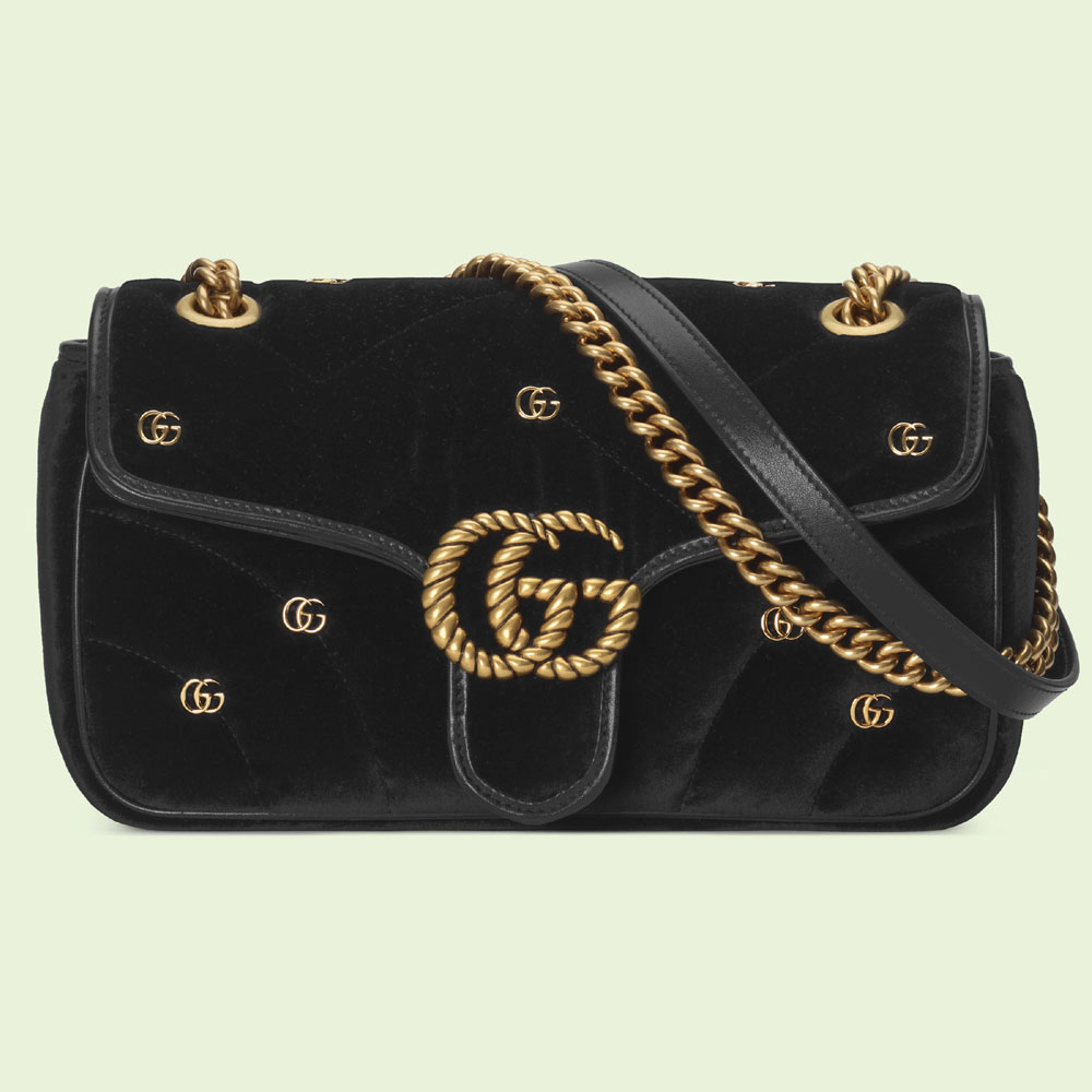 This GG Marmont small shoulder bag presents a softly quilted velvet version of the classic bag style. complete with small Double G studs. A tonal leather trim compliments the luxurious shade of black that heralds the beginning of a new season.