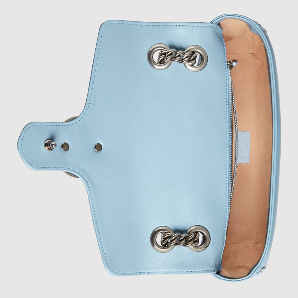 Pastels push the color focus throughout the Pre-Fall 2020 collection. In soft. Vibrant hues. Made in matelasse chevron leather with a heart on the back in a light shade of blue. Thenow recognizable small GG Marmont chain shoulder bag has a softly structured shape and a flap closure with Double G hardware. Designed to be worn multiple ways. The chain strap slides to change between a shoulder and a top handle bag.