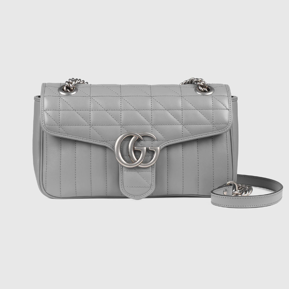 The Gucci Aria collection is an exploration of the Houses most emblematic codes and symbols. A member of the Beloved family. the GG Marmont is synonymous with its matelasse leather and monogram hardware. Here. the small shoulder bag is reimagined with a new geometric take on its signature finish that combines vertical and diagonal motifs.