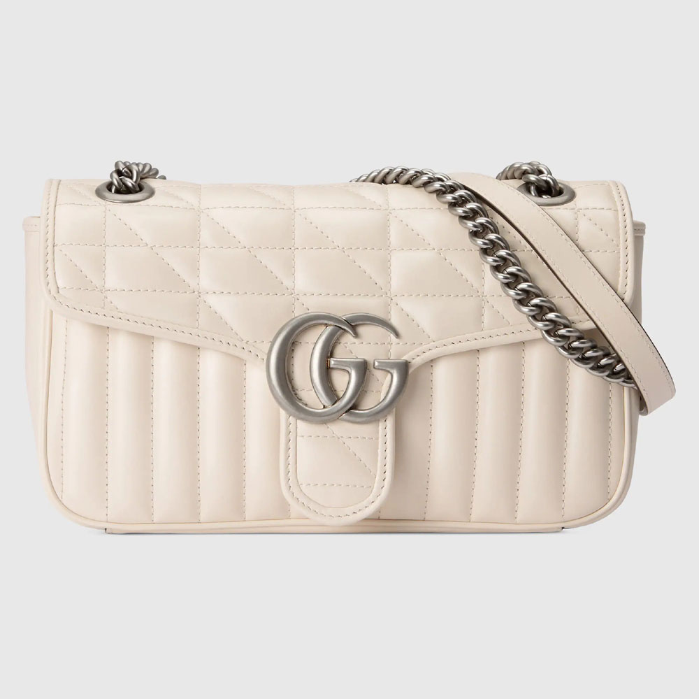 The Gucci Aria collection is an exploration of the Houses most emblematic codes and symbols. A member of the Beloved family. the GG Marmont is synonymous with its matelasse leather and monogram hardware. Here. the small shoulder bag is reimagined with a new geometric take on its signature finish that combines vertical and diagonal motifs.