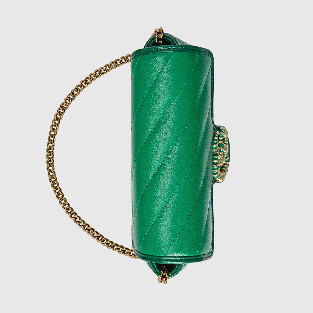 The GG Marmont super mini bag is introduced in matelasse leather in shades of green. The style is completed with the line's signature Double G hardwareenriched with enamel. Miniature versions of signature styles appear throughout the Ouverture collection adding a contemporary feel.