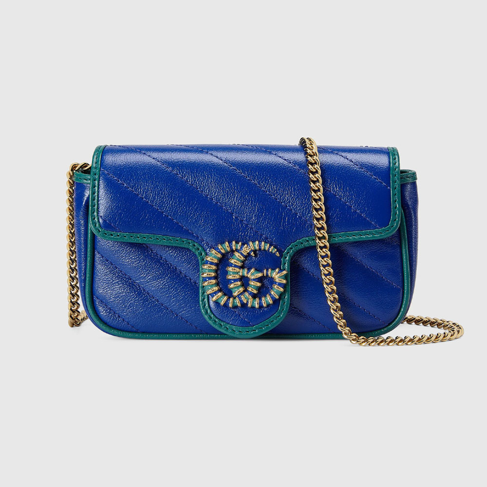 Recalling precious stones. styles from the House's Beloved universe appear in jewel tones for the Ouverture collection. The GG Marmont super mini bag is introduced in shades of sapphire inspired blue and completed with the line's signature Double G hardware—enriched with enamel.