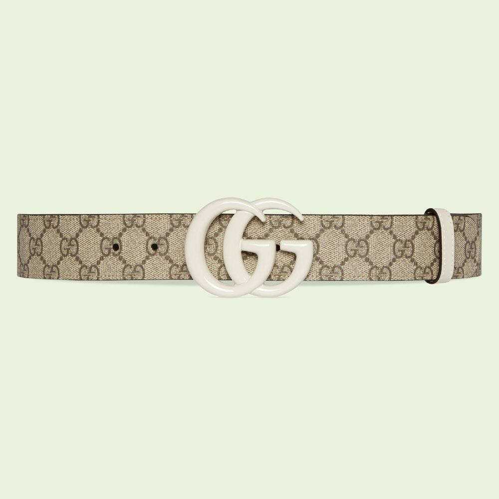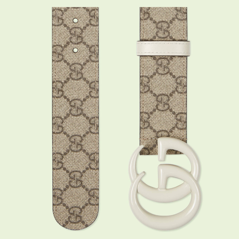 Featuring the Double G. this wide belt is defined by its monogram hardware. Now a recognizable Gucci symbol. the accessory is presented in GG Supreme canvas on one side and white leather on the other.