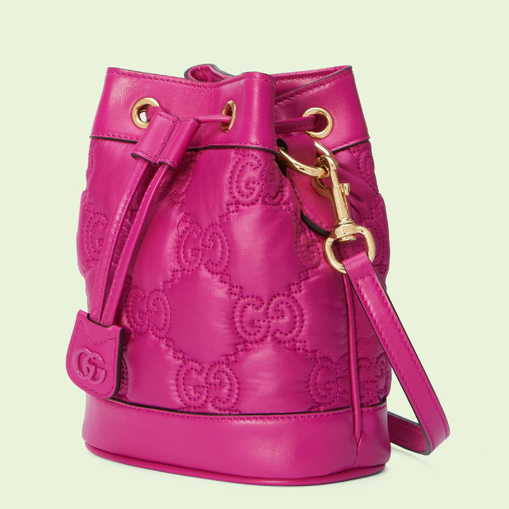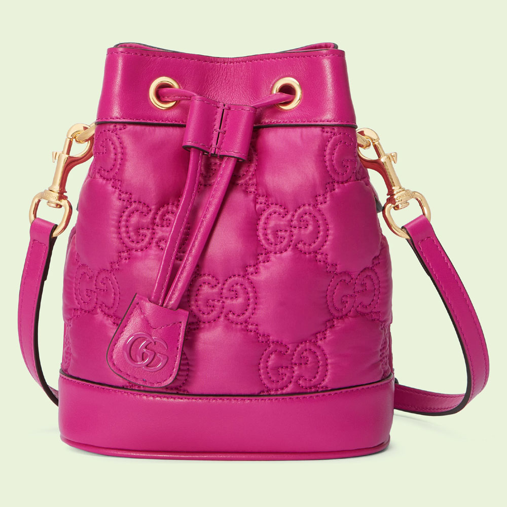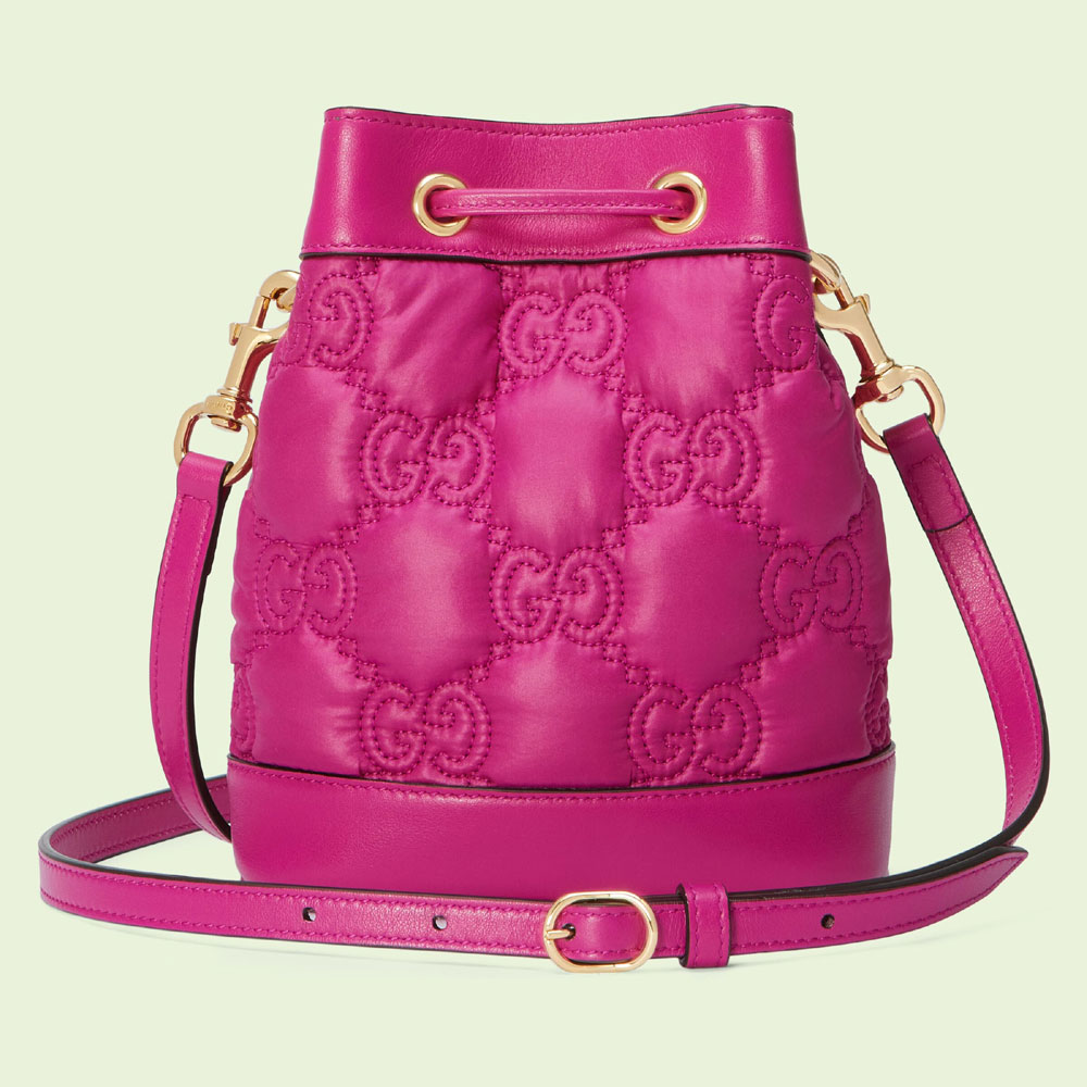 A new interpretation of the GG design. the textured Matelasse motif in nylon defines a selection of handbags. including this dark pink bucket bag. The Double G hardware decorates the front. continuing the logo feel of the design.