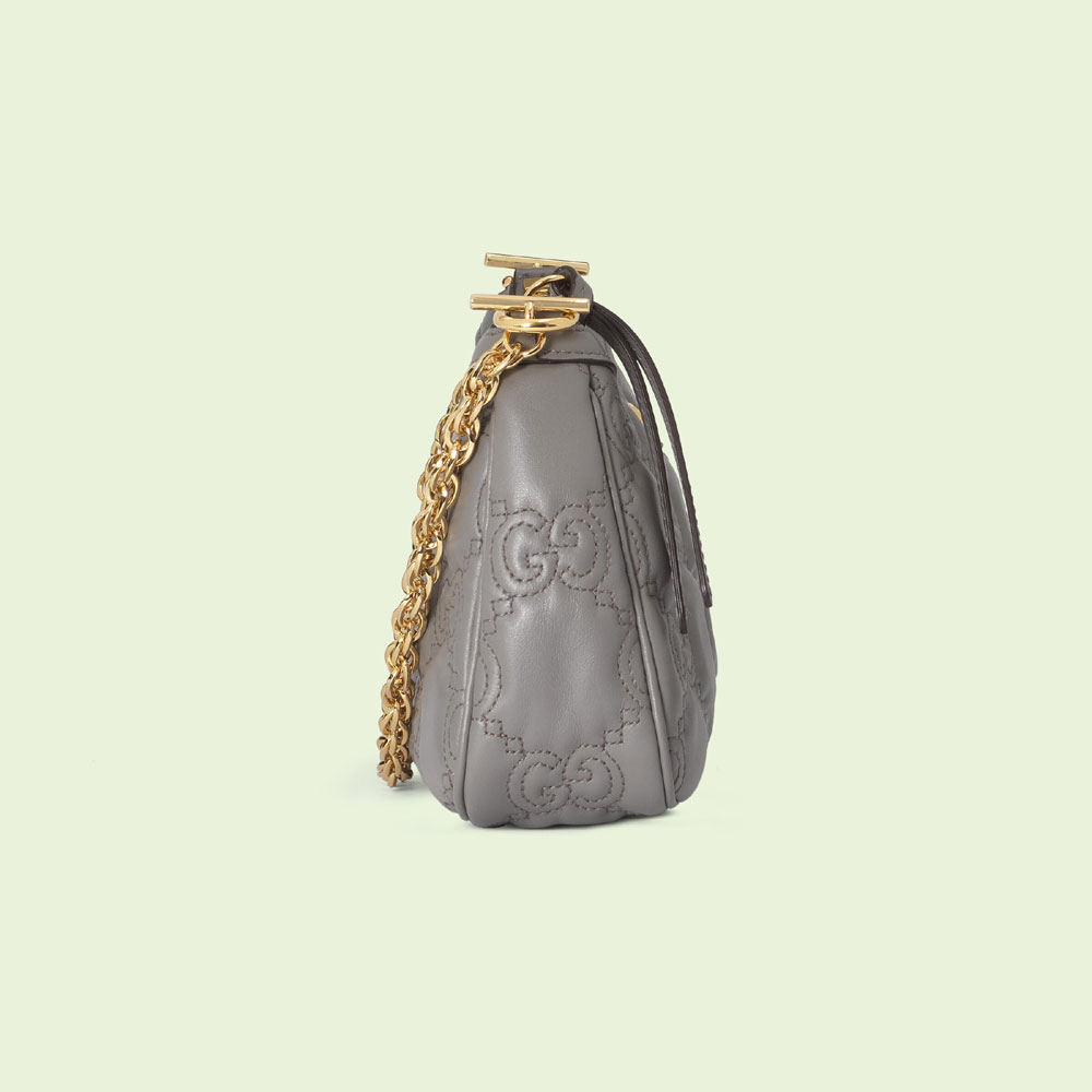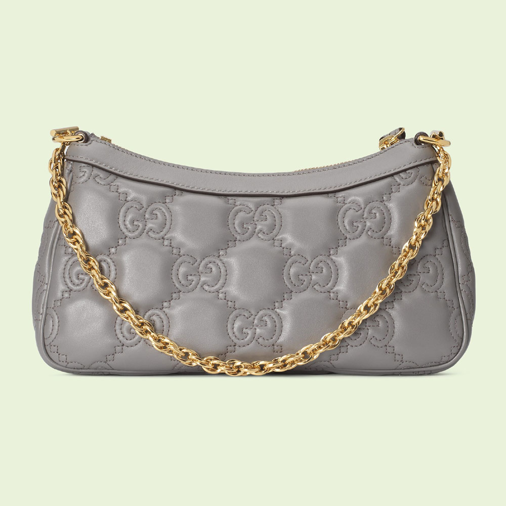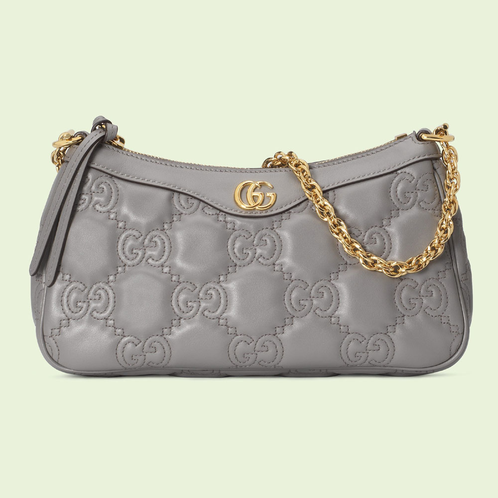 Matelasse leather is a signature material of the House. thanks to its super soft finish. The textured GG motif defines a selection of handbags. including this grey leather bag. The Double G hardware decorates the front. continuing the logo feel of the design.