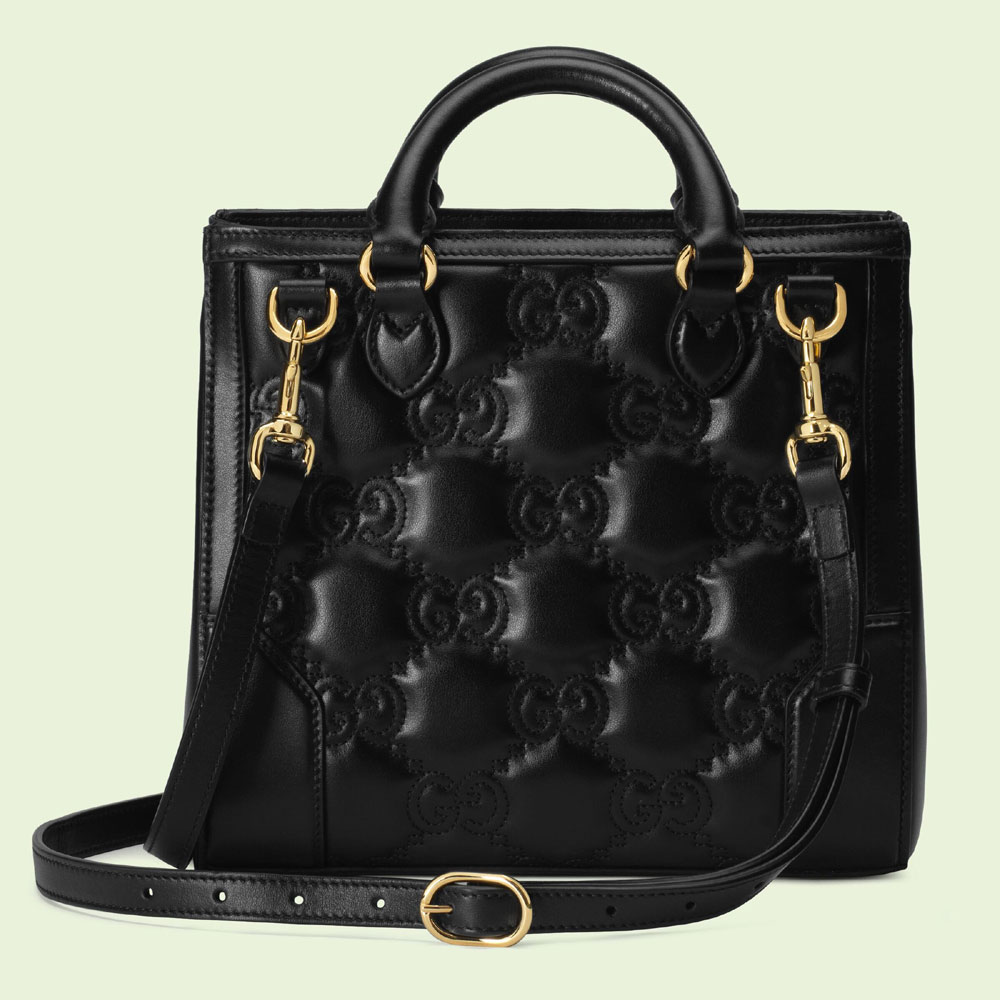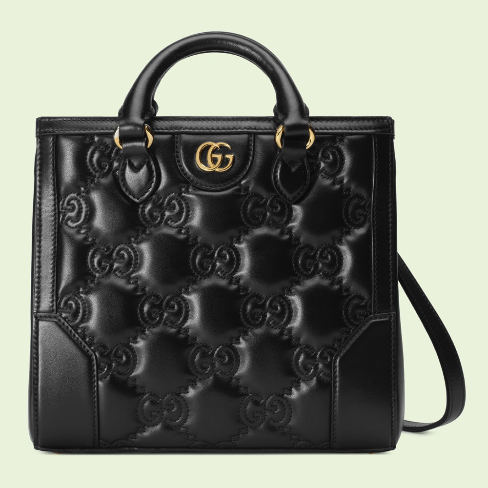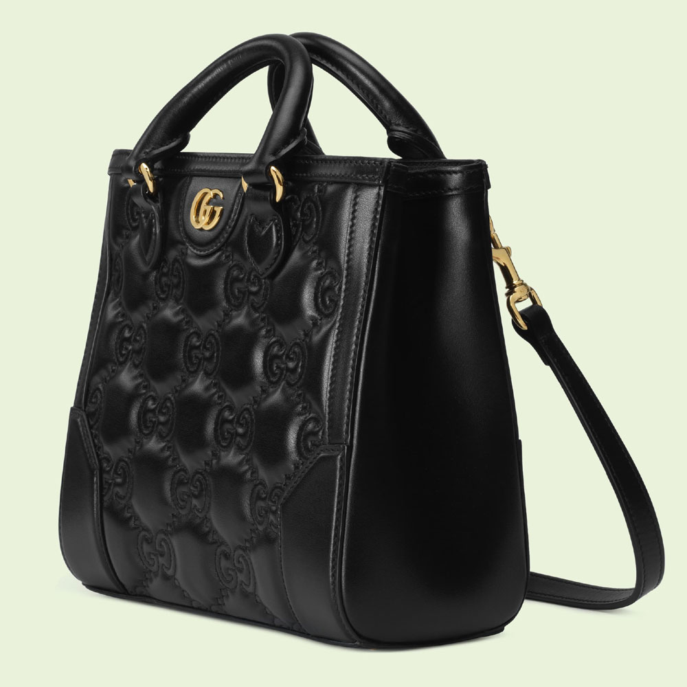 Matelasse leather is a signature material of the House. thanks to its super soft finish. The textured GG motif defines a selection of small leather accessories. including this black leather top handle mini bag. The Double G hardware decorates the front. continuing the logo feel of the design.