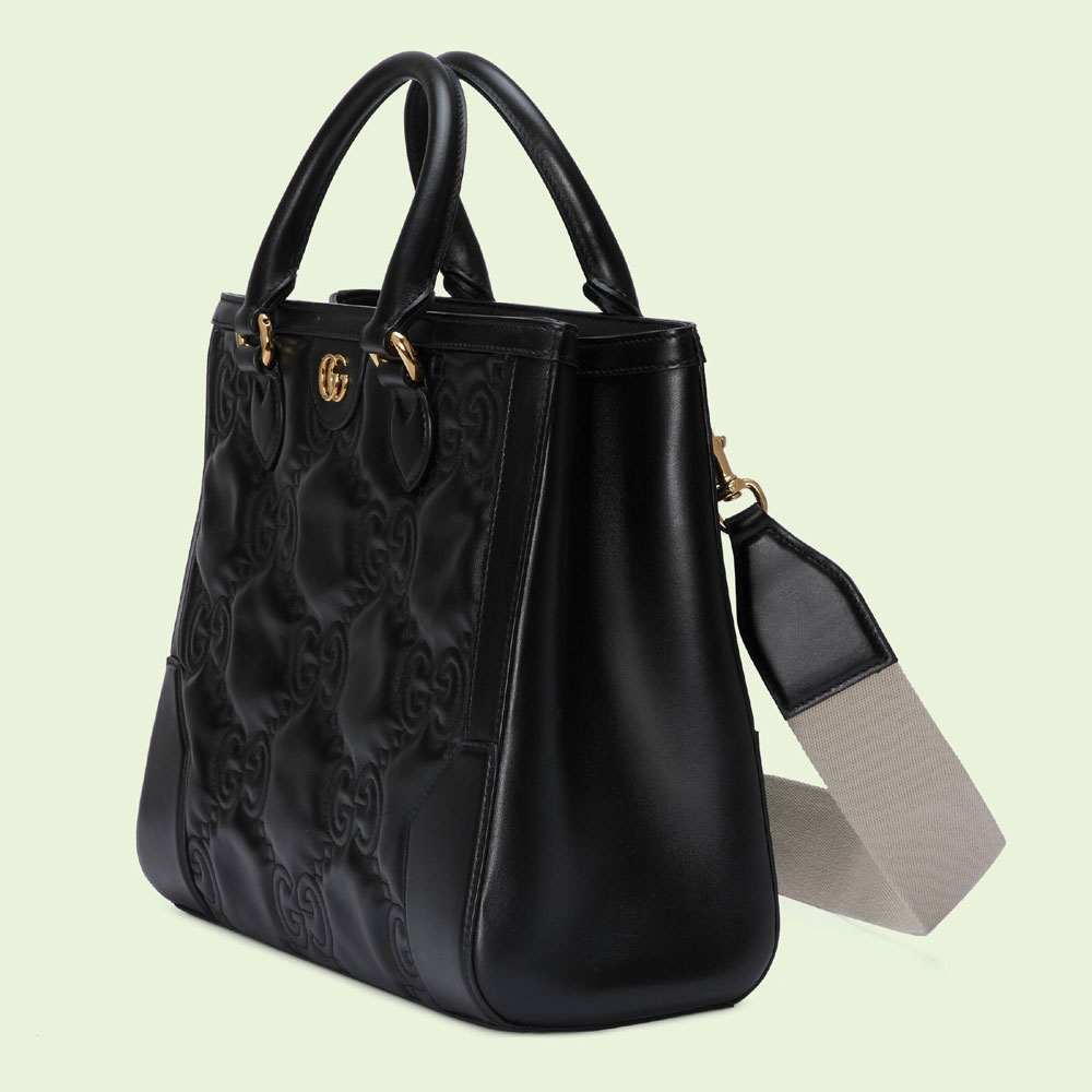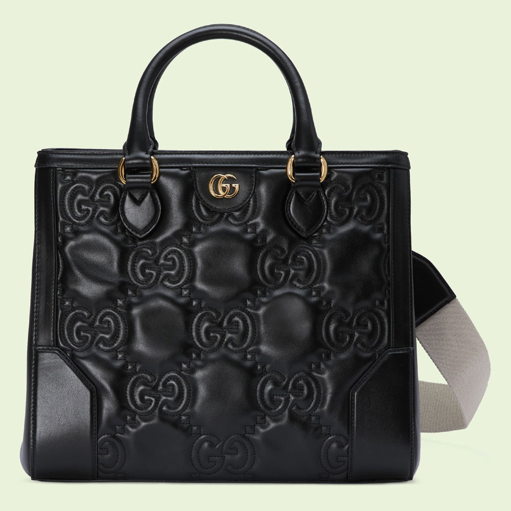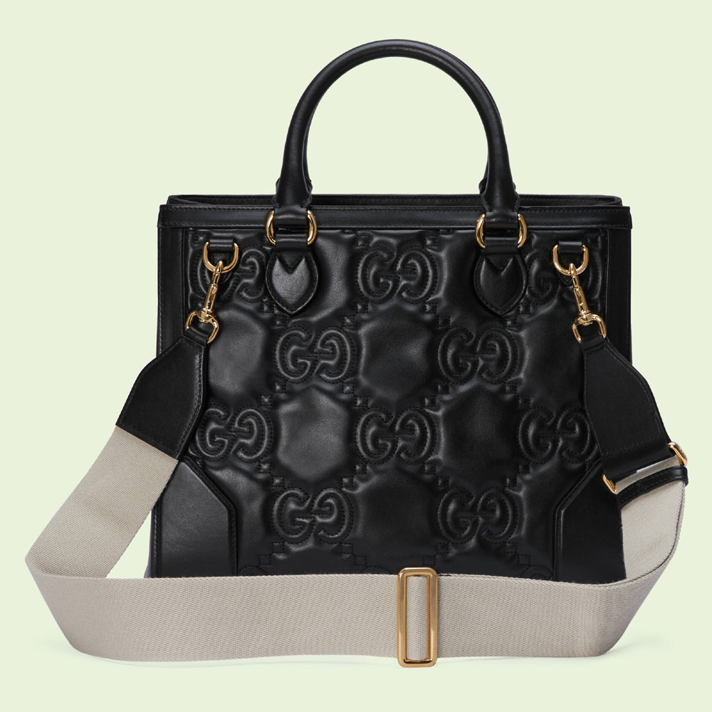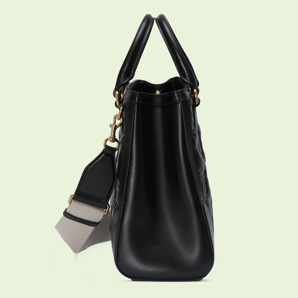 Matelasse leather is a signature material of the House. thanks to its super soft finish. The textured GG motif defines a selection of handbags. including this black leather tote bag. The Double G hardware decorates the front. continuing the logo feel of the design.