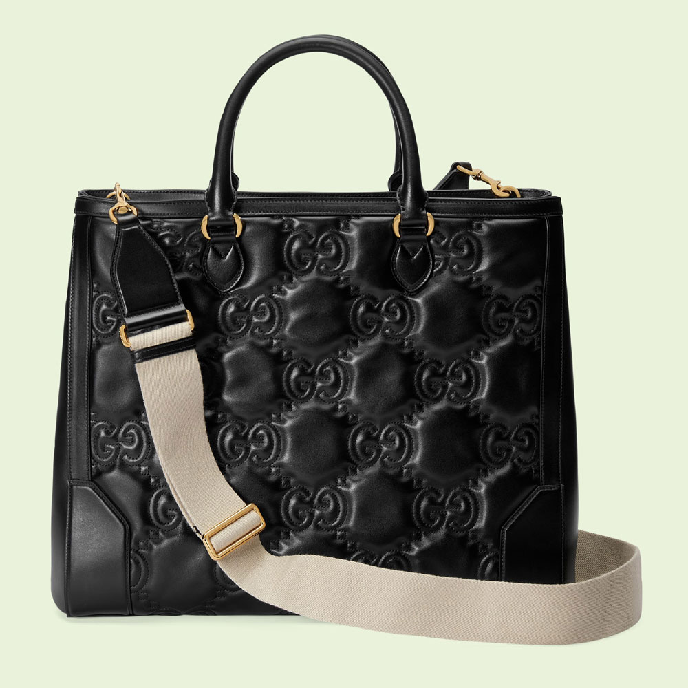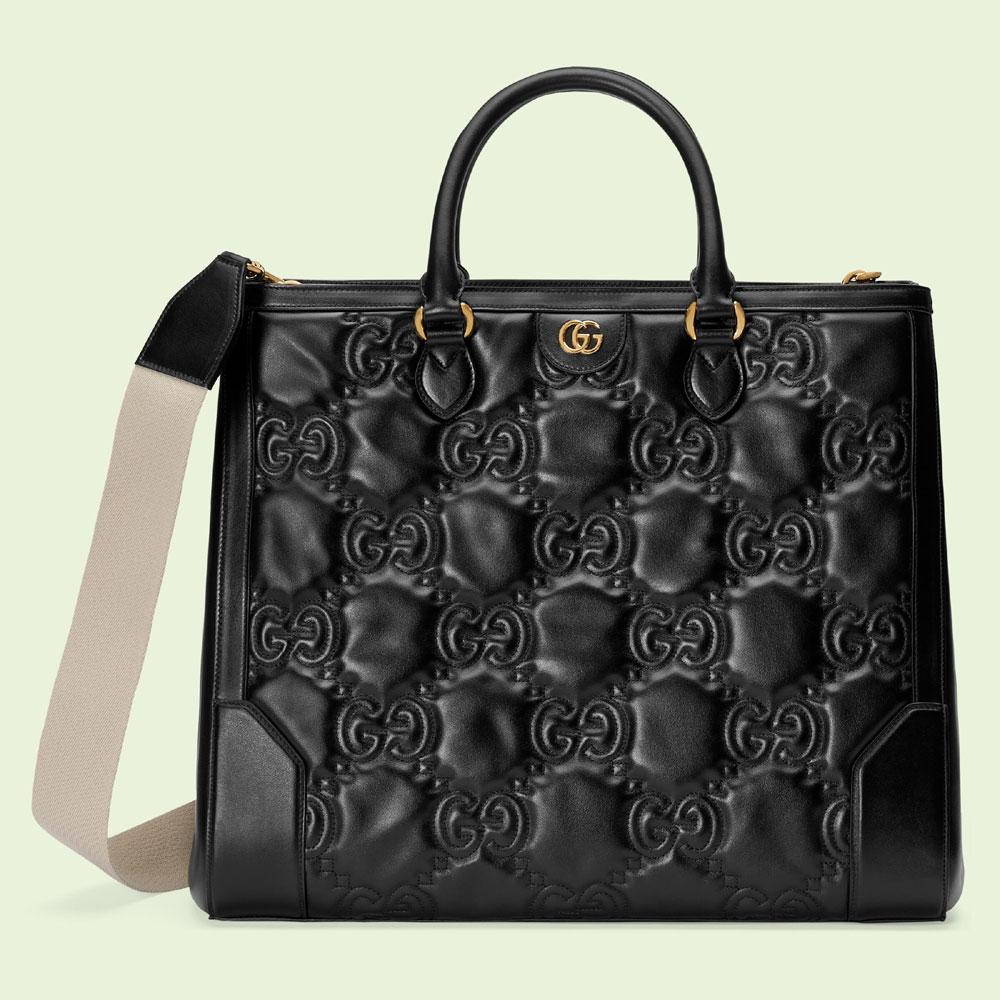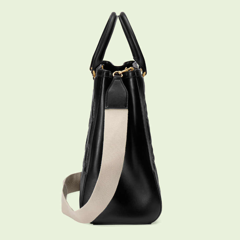 Matelasse leather is a signature material of the House. thanks to its super soft finish. The textured GG motif defines a selection of handbags. including this black leather tote bag. The Double G hardware decorates the front. continuing the logo feel of the design.