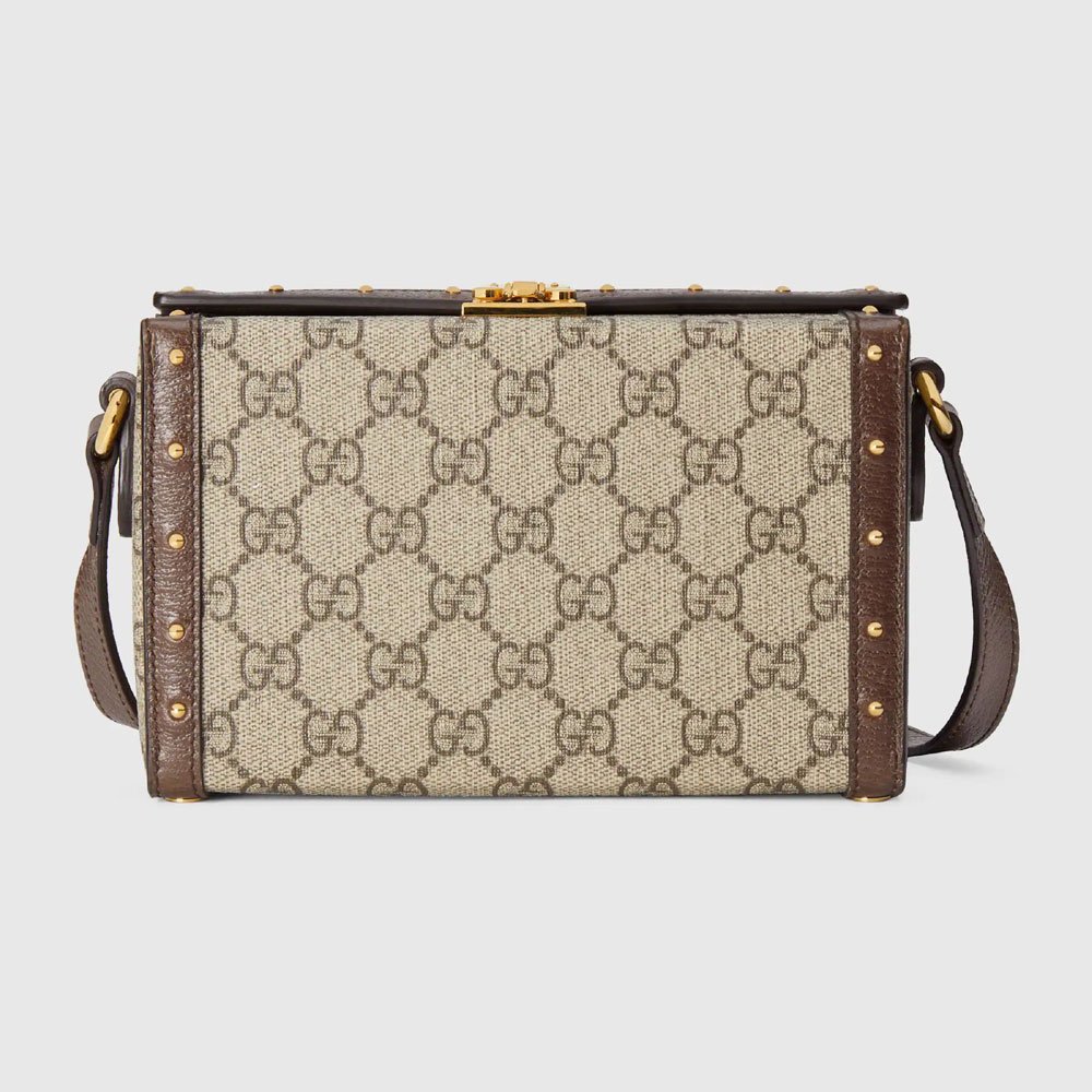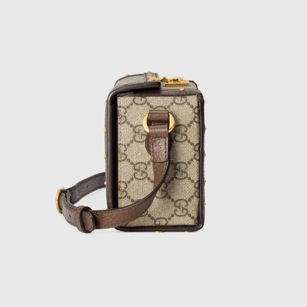 The Aria collection delves into the archives. presenting designs with rich vintage-inspired designs. This mini bag is presented from beige and ebony GG Supreme canvas with a leather shoulder strap. Reminiscent of trunks from decades past. the trim is finished with stud details. Size:19 x 10 x 8CM