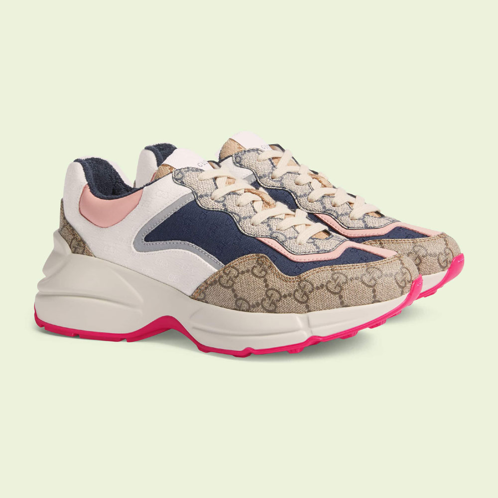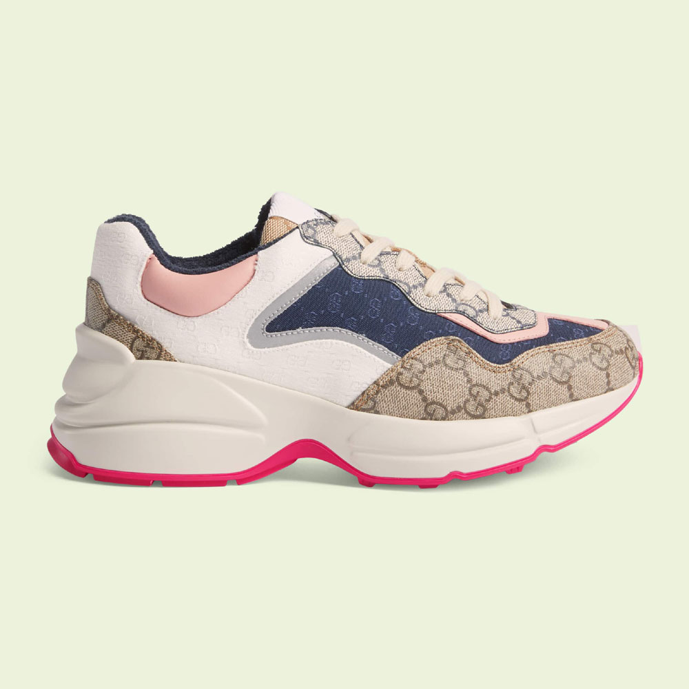 The Houses emblematic sneaker is revisited as part of the Spring Summer 2020 collection where styles work together to create a language of self-expression. Defined by a thick sole and chunky construction. the Rhyton is presented in a mix of monogram fabrics and trimmed in leather and reflective material. Archival fabrics are reimagined through Guccis hybrid design narrative. On top of this shoe. GG Supreme is combined with a mini version in contrasting colors and with Original GG canvas for a retro logomania approach.