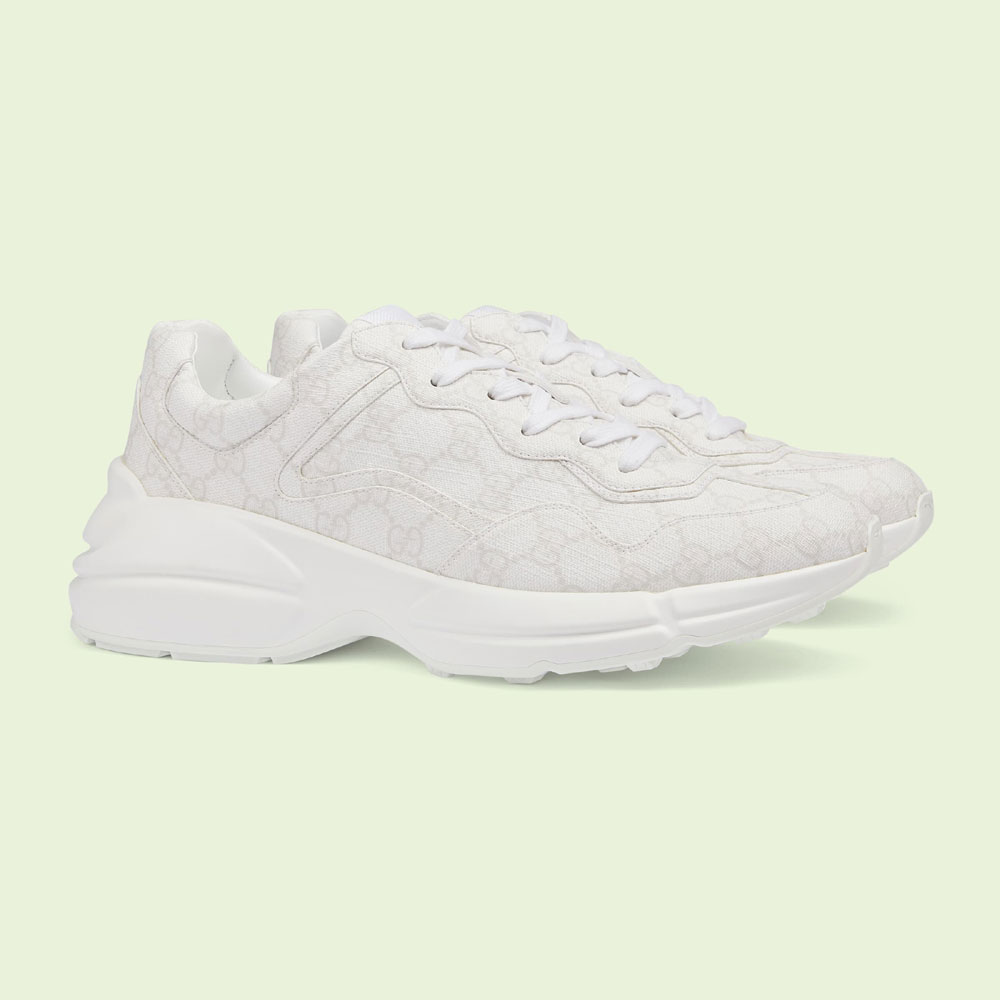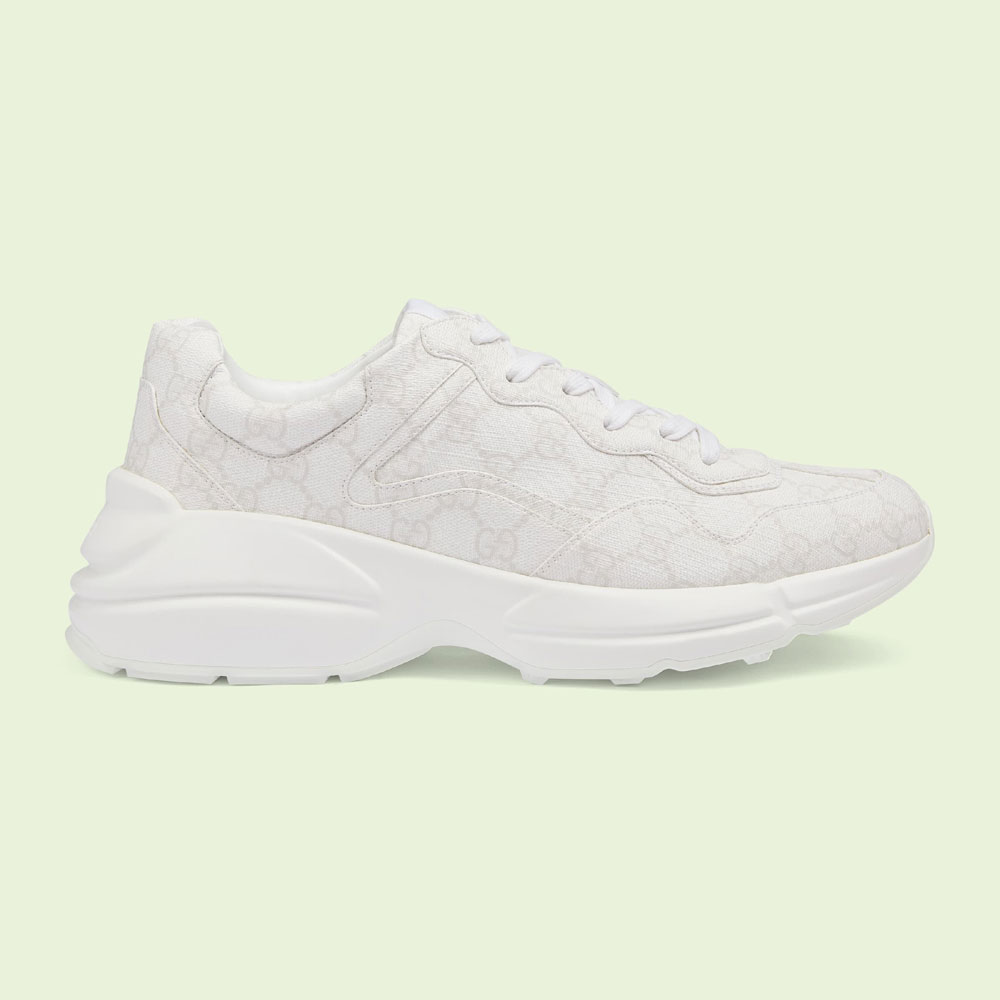 Building on its historic origins. GG Supreme is introduced in new colors and atop unexpected styles for the Gucci Love Parade collection. The canvas has come to the front of each collection decade after decade to become a hallmark of the House. Here. this Rhyton sneaker is crafted from the material in a minimalist shade of white.