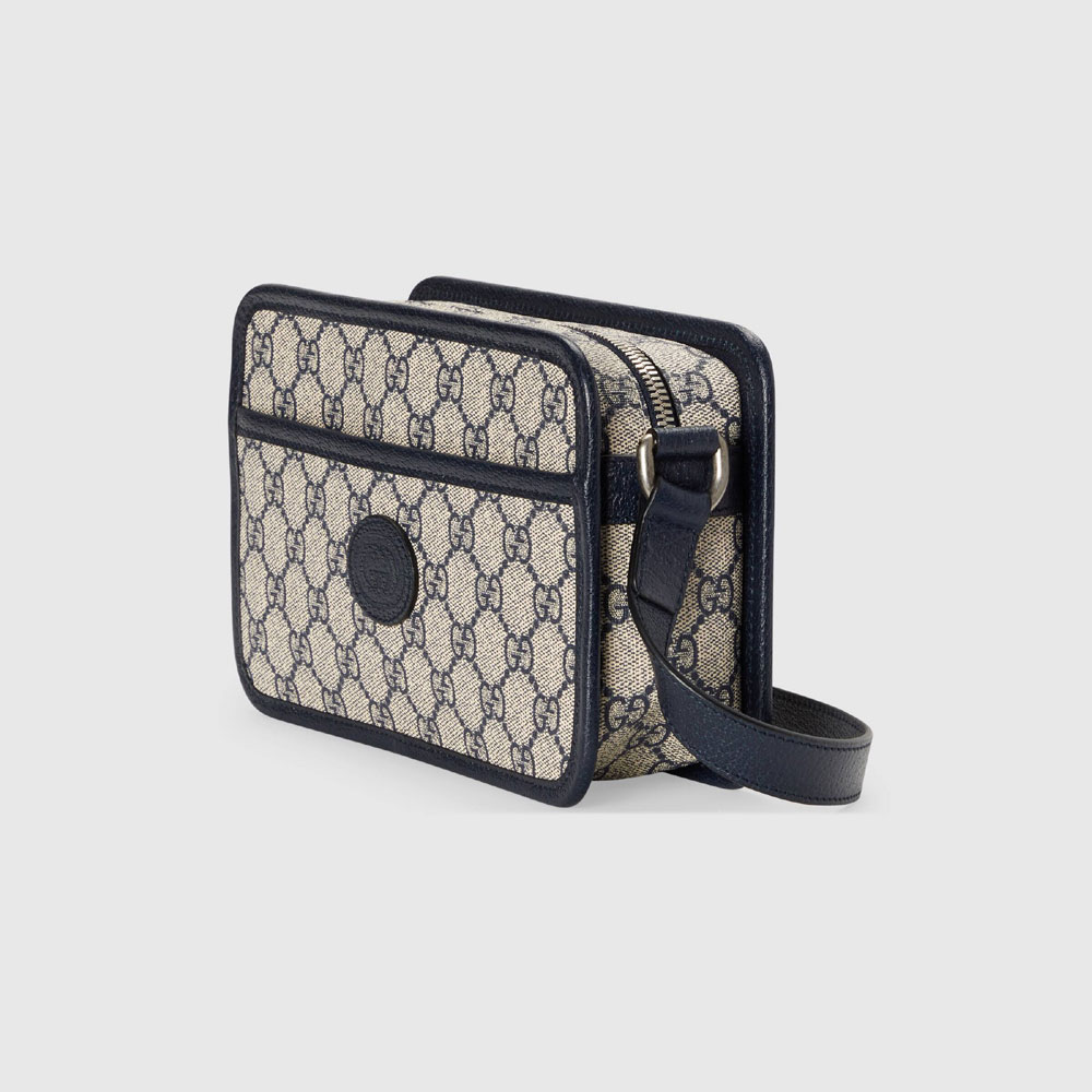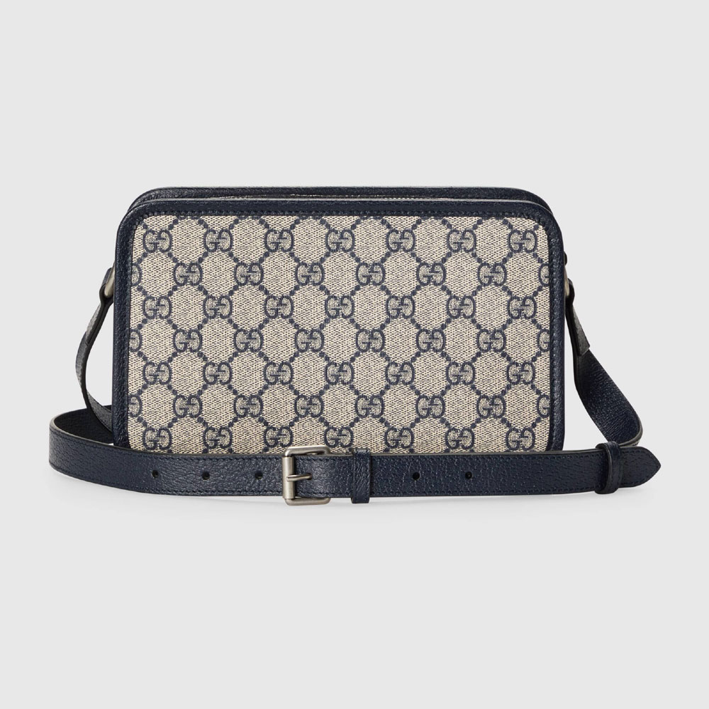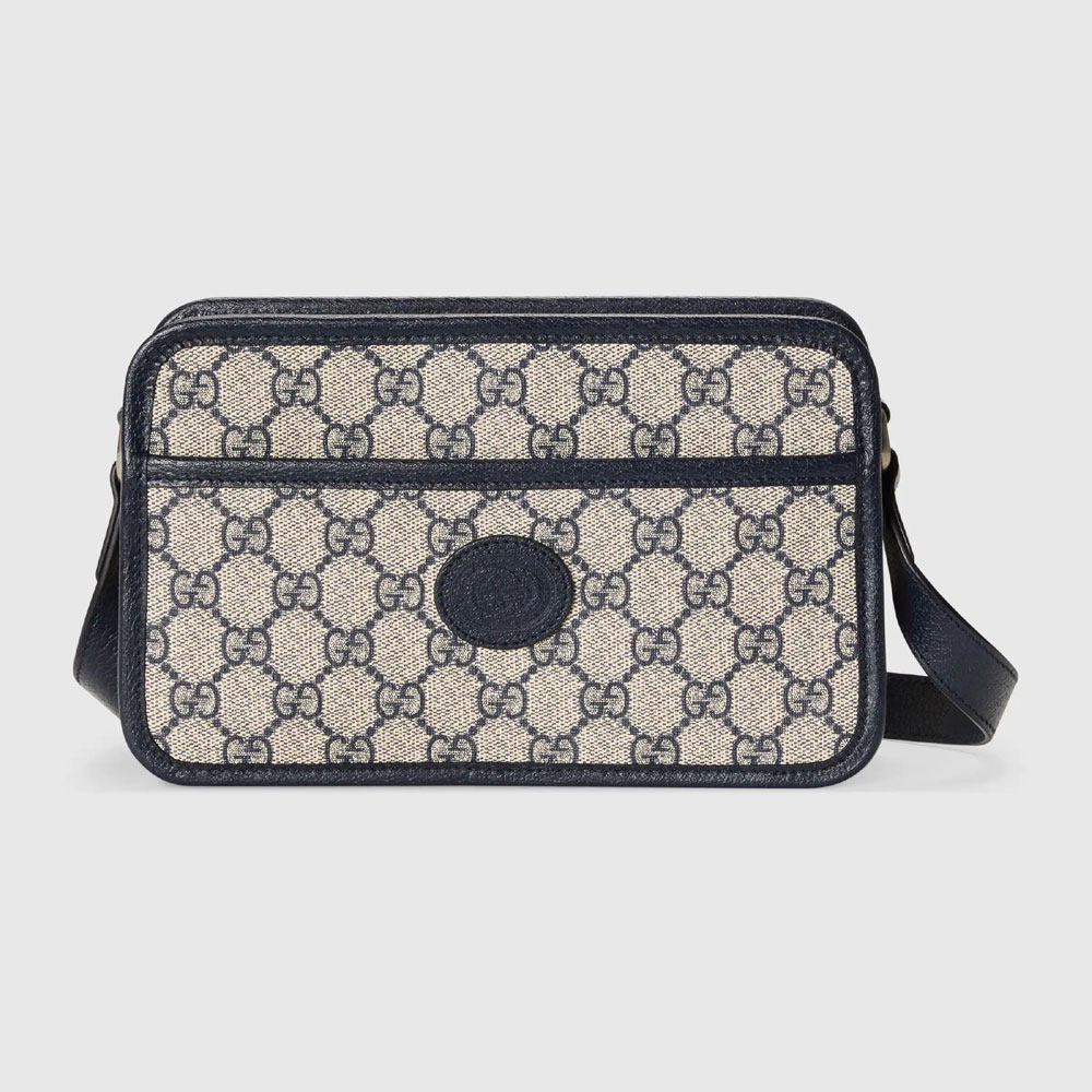 Mirroring the material's historic origins. GG Supreme is introduced in a timeless mix of blue and beige for Gucci Love Parade. With a low environmental impact. the canvas has come to the front of each collection decade after decade to become a hallmark of the House. Here. the classic palette defines this petite shoulder bag.