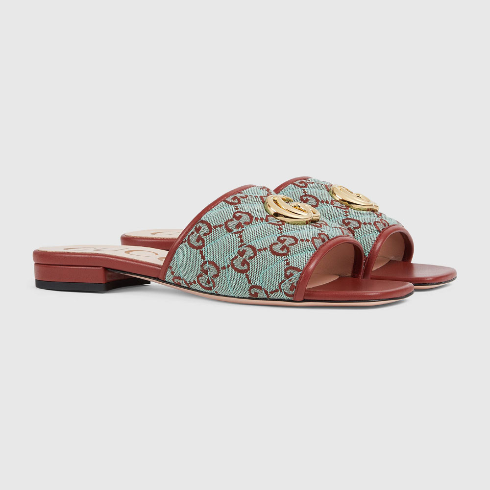 Marking the 100th anniversary of the House. Aria is a celebration of the history of Gucci. Taking cues from the archive. the most recent collection is a culmination of symbols. silhouettes and prints defining the ready-to-wear and accessories selection. Here. this pair of GG slide sandals is crafted from blue and brown GG canvas with a red leather trim.