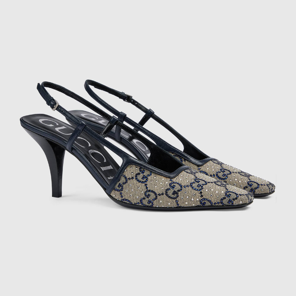 Mirroring the patterns historic origins. the GG motif is introduced in a timeless mix of blue and beige for Gucci Love Parade. Coming to the fore of each collection decade after decade. the monogram design has become a hallmark of the House. Here. this pair of mid-heel slingback pumps presents a contemporary twist with the addition of sparkling crystals.