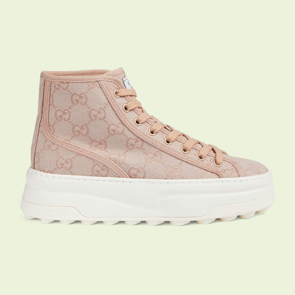 Crafted from pink Original GG canvas. these high top sneakers offer a silhouette that takes its inspiration from the tennis courts. A chunky rubber sole is enriched with an Interlocking G grip. offering a whimsical addition to dressed down looks.