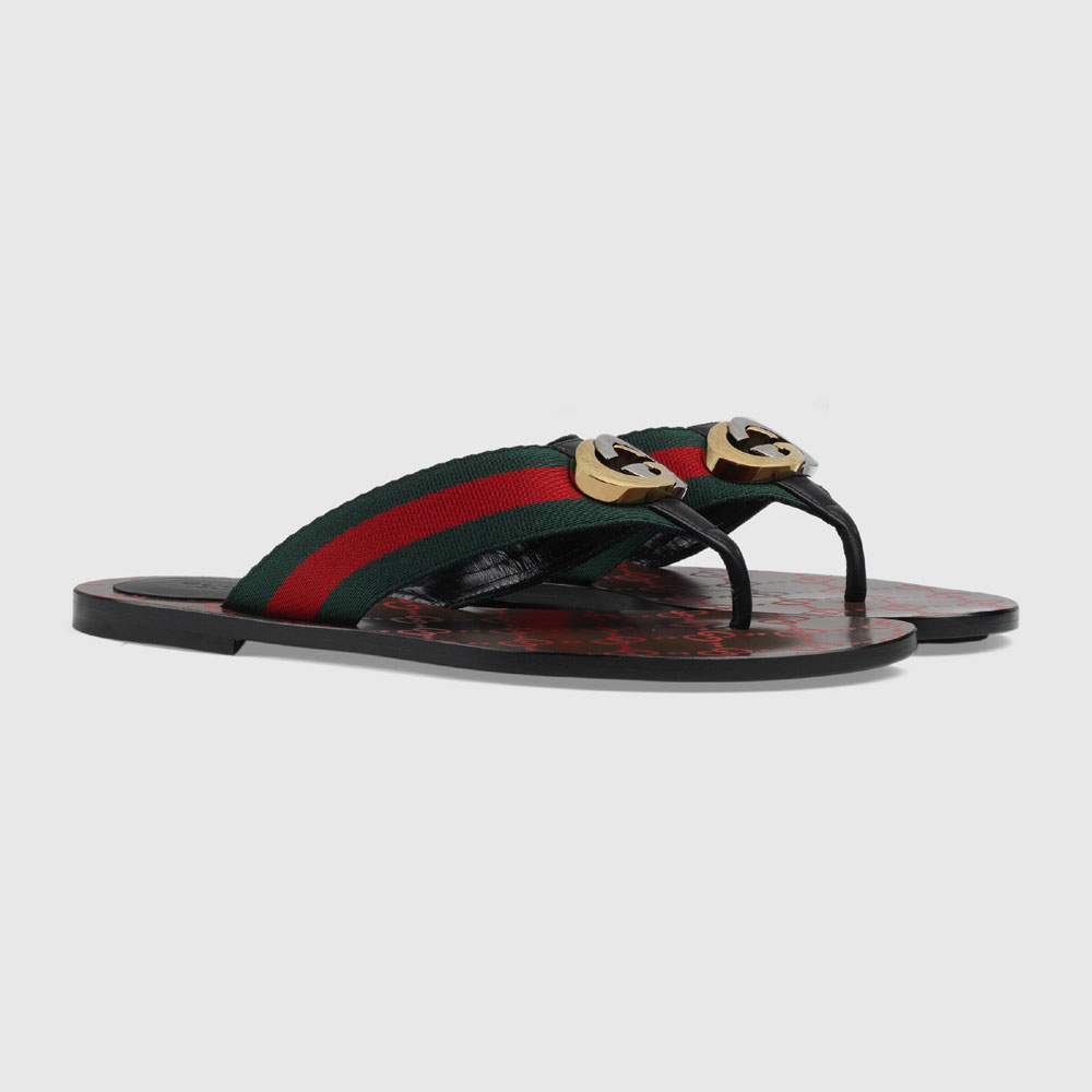 Bringing several House elements together. the thong sandal combines green and red Web straps with a GG patterned sole and Interlocking G hardware in a modern mix of silver- and gold-toned metals.