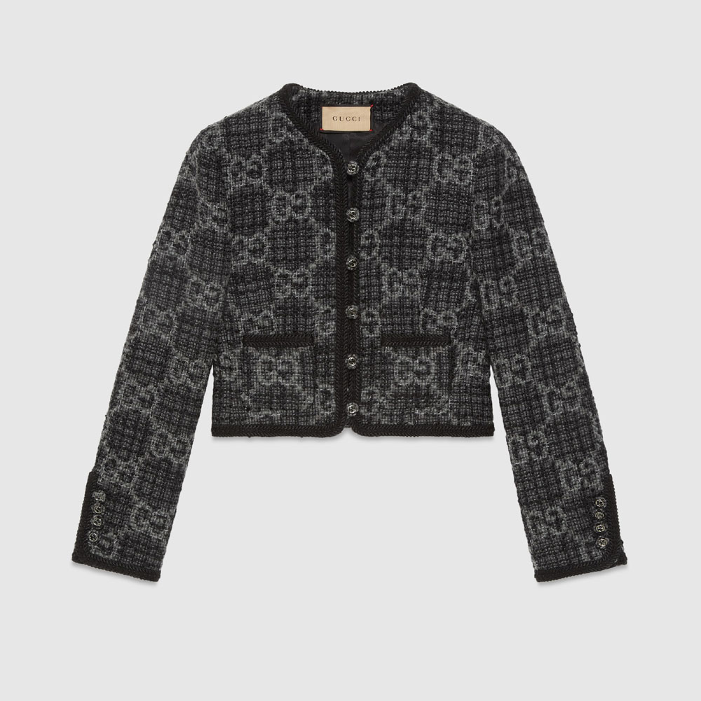Gucci puts a twist on tweed by innovating the traditional textile with the House's Web design. The new collection's tweed blazers and skirts, which can be worn separately or as a suit, exude colorful style. Presented in dark grey and grey tonal GG tweed