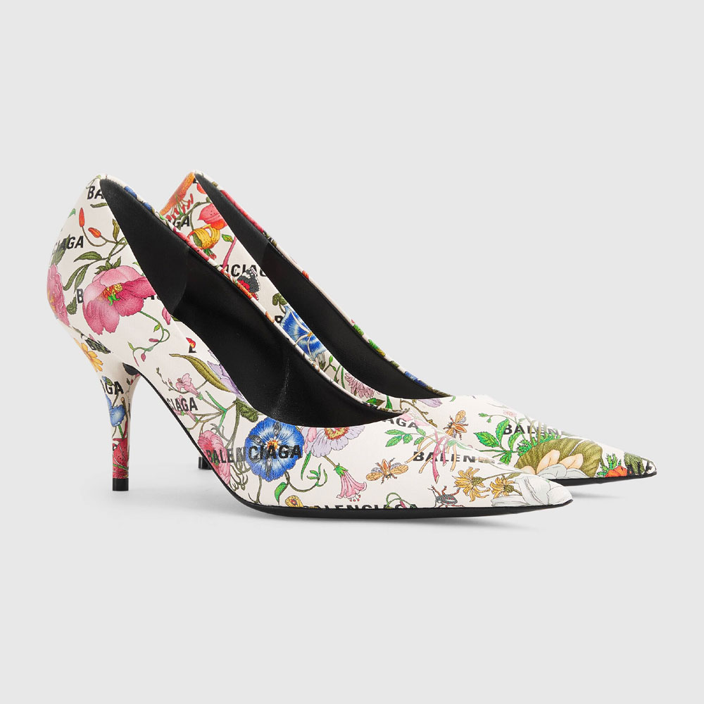 Exploring ideas of authenticity and appropriation within the fashion industry. Gucci Aria unveils The Hacker Project. In his latest collection. Alessandro Michelein expressions of homageinfuses iconic Balenciaga silhouettes with Gucci codes in unique creations. Here. the Knife pump is reimagined in the Balenciaga Flora print.